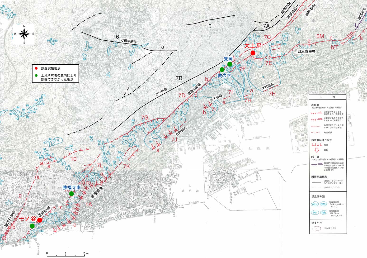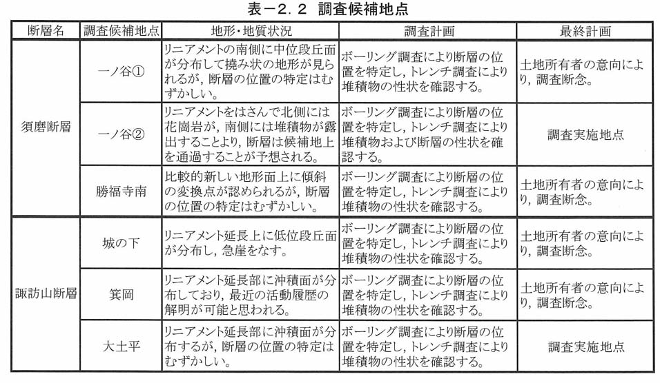 表2−1に示した各断層について予察調査を実施した結果,図2−2および表2−2に示す候補地点を選出し,各候補地点の土地所有者と交渉した結果,表2−2に示す2地点において調査可能となった。すなわち,須磨断層は一ノ谷A地点(今後,一ノ谷地点とする),諏訪山断層は大土平地点において調査の承諾が得られ,これら2地点において詳細な調査を遂行することにした。これら2地点における地形地質の概況を,表2−2および図2−3−1、図2−3−2に示す。なお,図2−3−1、図2−3−2におけるリニアメント区分は,兵庫県(2002)に従っている。