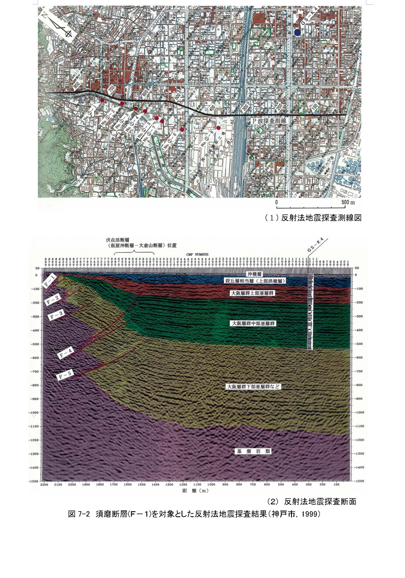 須磨断層を対象とした反射法地震探査は,神戸市(1999)によって須磨区板宿町(本調査地点の北東約3 km)において実施されている。探査結果は図7−2に示すとおりである。これより,須磨断層は複数の断層によって構成されており,その最北縁を通る断層が須磨断層に対応する。これら一連の断層による基盤岩の上下落差は約1000 mと推定される。神戸市(1999)によれば,図7−2中のF−4断層においては,ボーリング調査結果より,鬼界アカホヤテフラ層準(約7,300年前)と姶良Tnテフラ層準(約26,000〜29,000年前)がそれぞれ約2 mと約6 mの上下変位している可能性を指摘している。また,ここに推定されている断層の形態は,上述したボーリング調査結果(IT−6地点)と整合するものである。図7−2 須磨断層(F−1)を対象とした反射法地震探査結果(神戸市,1999)
