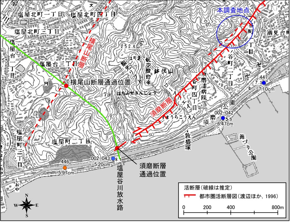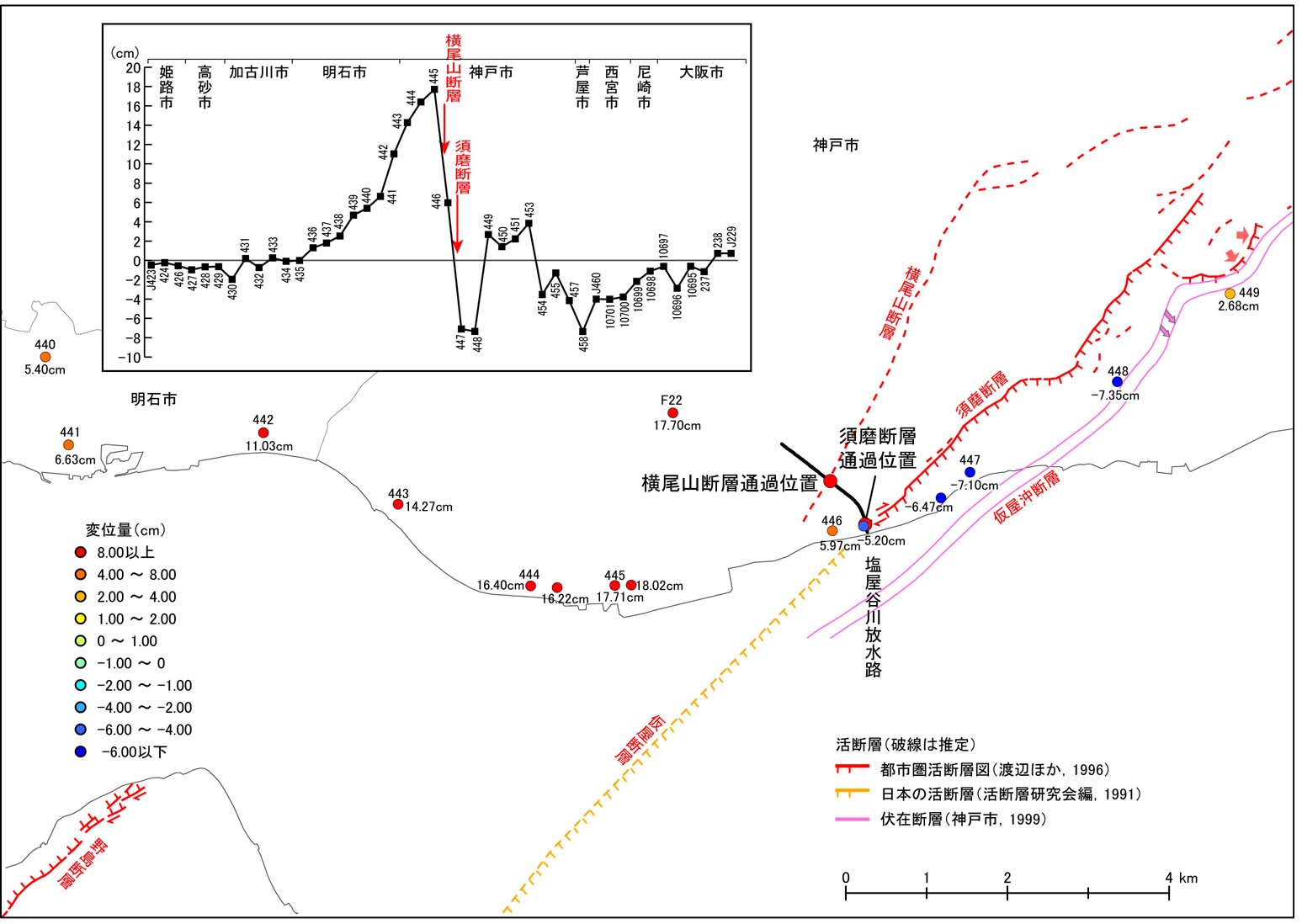 図7−3−1、図7−3−2に示されるように,約24cmの上下変動を示した区間は水準点No.445〜447の間であり,この区間を横尾山断層および須磨断層の南西方延長部が通過すると予想される。横尾山断層は,北西側の神戸層群に南東側の花崗岩が衝上する南東側隆起の逆断層である。これに対して須磨断層は,南東側の堆積層に北西側の花崗岩が衝上する北西側隆起の逆断層成分を持つ。この2本の断層に挟まれた花崗岩からなる鉄拐山−鉢伏山山塊は,これらの断層が活動することによって上昇してきた地塊と考えられている。しかし,上記した水準測量結果によって明らかとなった西上がりの地盤変動は,横尾山断層よりもさらに西側の地域で最大となっており,鉄拐山−鉢伏山山塊の隆起運動とは異なる傾向を示している。