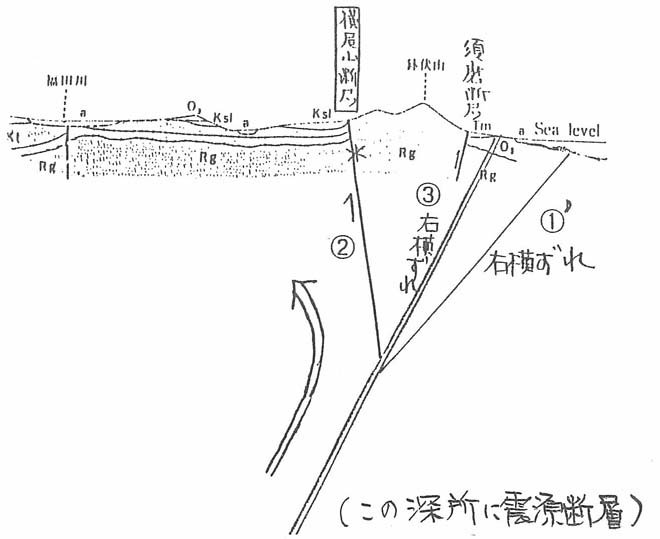 櫻井(1995a,1996)は,このトンネルの変形や種々の地盤変状などの情報(櫻井,1995bなど)をもとに,横尾山断層が北西側隆起の右横ずれ正断層の地震断層と考え,図7−4に示すような,地下深部の震源断層から分岐して,西側が突き上げられて生じた断層メカニズムを想定している。