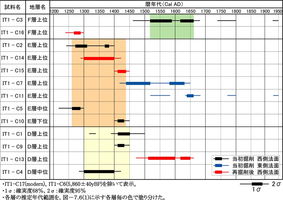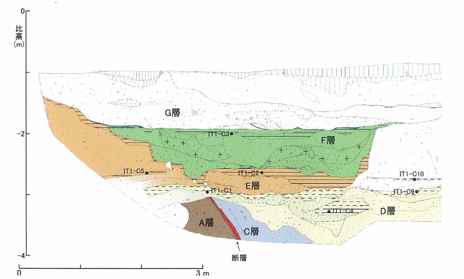 4章で述べた,一ノ谷の第1トレンチの様子とトレンチ法面より採取された腐植質層の炭素年代測定結果をまとめて示すと,図7−6−1、図7−6−2のようになる。図に示されるように,得られた炭素年代値と試料の上下関係がすべての試料において整合していないが,同じ法面においては,断層を直接に覆うD層の測定値はほぼCal. AD1300〜1450付近に集中する。これにより,本トレンチ地点の須磨断層の最新活動時期は,現在より約600年前以前と推定される。なお,図7−6−1、図7−6−2に示されるように,D層とE層では堆積年代にあまり間隙はないようである。図7−6−1 第1トレンチ西側法面スケッチ図