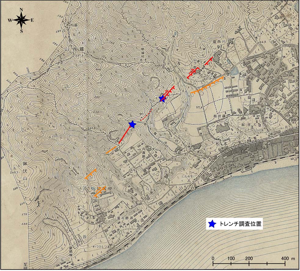 図7−1−1、図7−1−2、図7−1−3は,本年度の調査地域である一ノ谷地点周辺のリニアメントを,古地形図に重ねて図示したものである。これらの地形図や空中写真の判読などより,現在では人工改変によって不明瞭となっているが,地形的に右横ずれした河谷が見られるので,須磨断層は右横ずれが卓越し,北西(山)側が隆起した活断層と認定される。