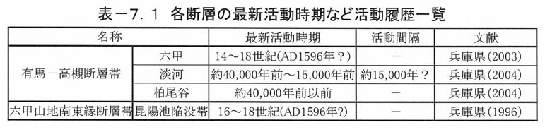 これまでに兵庫県が実施して明らかとなった六甲山地周辺地域に分布する各断層の活動性をまとめると,表7−1のとおりである。