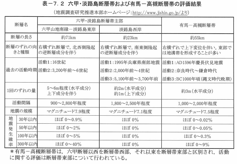 文部科学省に設置された地震調査研究推進本部は,これまでに行われた活断層調査やその他の研究成果をまとめて,日本全国に分布する主要な活断層の長期的な評価を実施してきている。六甲・淡路島断層帯の長期評価が平成17年1月12日に公表され,また,有馬−高槻断層帯の評価も平成13年6月13日(同年7月11日訂正)に発表されている。それらの評価結果をまとめて示すと,表7−2のとおりである。