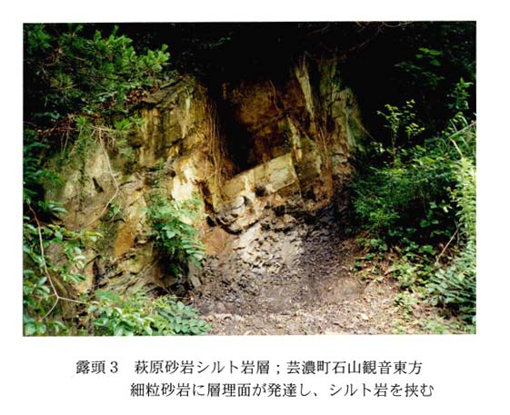 ・ 岩相:主に砂岩シルト岩互層からなり、一部で塊状シルト岩や細粒砂岩が卓越する。砂岩シルト岩互層は、細粒砂岩、極細粒砂岩及びシルト岩からなる互層で、単層の厚さは10〜60cm程度である(写真3−2−7 露頭7)。塊状シルト岩は津市片田町や久居市戸木町周辺に見られ、新鮮面で暗灰色、風化面で淡黄褐色を示す。細粒砂岩は久居市戸木町の蛇川沿いに見られ、石灰質団塊やシルト岩のブロックを含む。