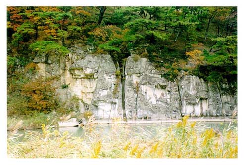 写真11 白石市南台付近に分布する直立した熔岩,凝灰岩(鉢森山層)
