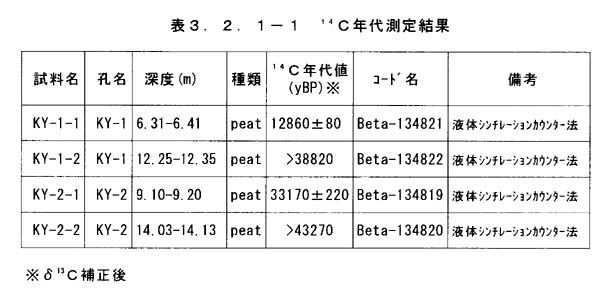 KY−1孔及びKY−2孔に認められる腐植質シルト層から試料を採取し14C年代測定に供した.14C年代測定結果を表3−2−1−1に示す.
