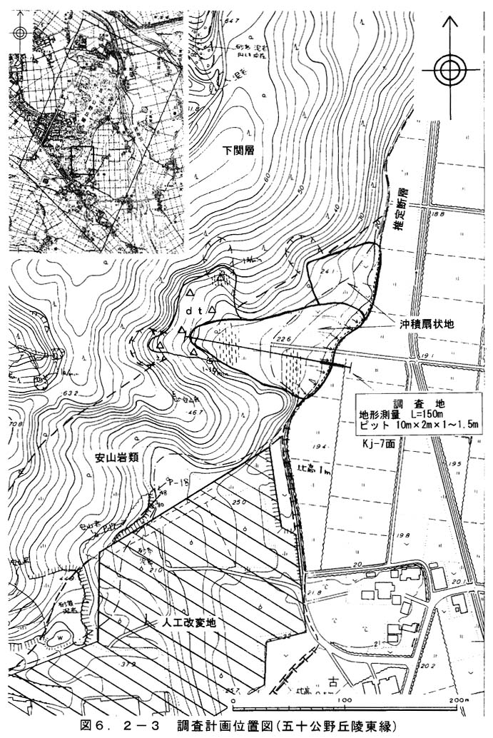 調査箇所として,図6−2−3に示す五十公野丘陵東南部に分布する沖積扇状地を候補地として挙げる.地形測量では,沖積扇状地面に断層の存在を推定させるような崖地形があるか否かを確認する.また,ピット調査は沖積扇状地の末端を挟んで東西方向に長さ20m程度,深さ1〜1.5m程度の溝を掘削し,地層の変位・変形の有無等を確認する.