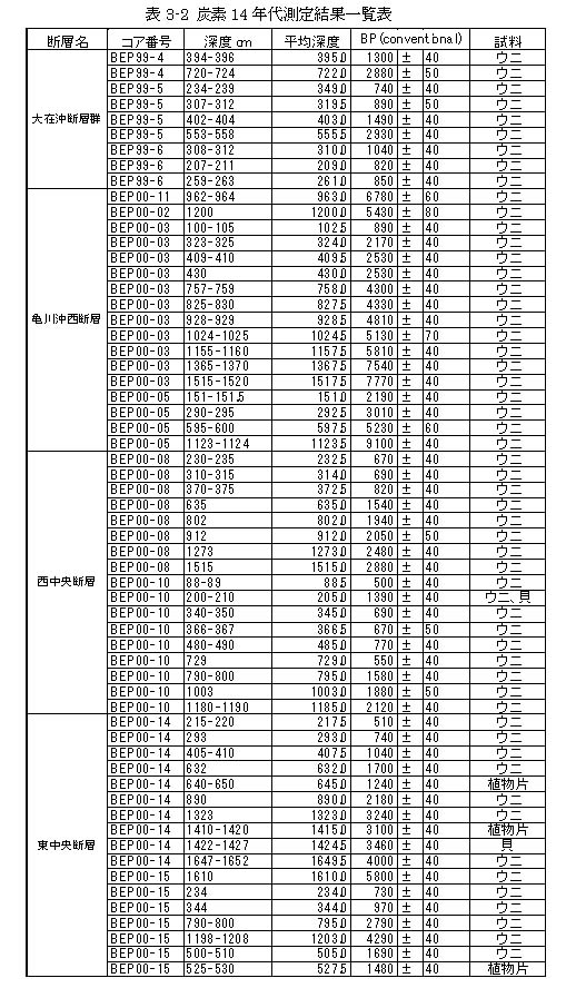 各コア試料からサンプル60試料(主にウニ、貝殻)を採取、炭素14法により年代測定を実施した。このうち、今年度調査の3断層からのサンプルに加えて昨年度調査を実施した大在沖断層群からのサンプルの測定も行った。これは、のも加えて別府湾内の断層全体の活動様式を考察することを目的として