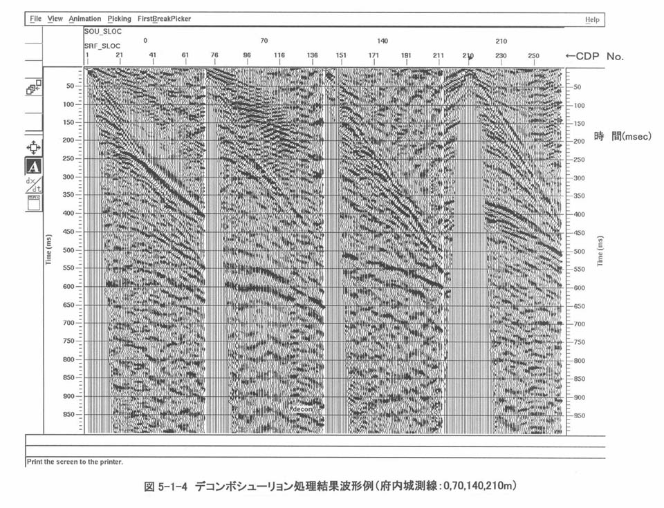 図5−1−8には、時間断面に深度変換を施した結果(深度断面)を示す。深度変換には、図5−1−5に示した速度テーブルを平滑化して用いた。