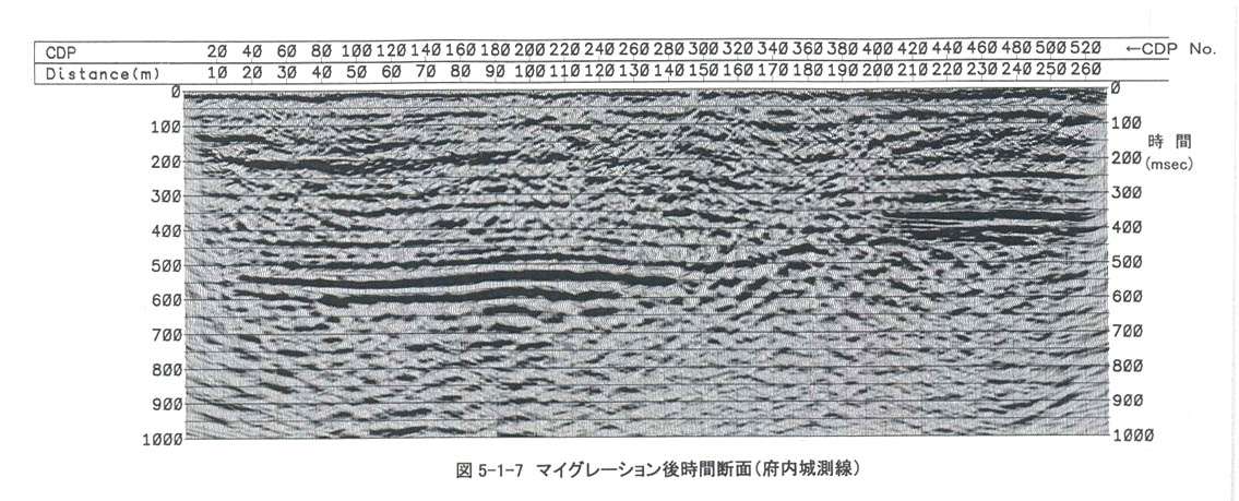 図5−1−5には速度解析結果より求めた区間速度分布を示す。図5−1−6には速度解析結果よりCDP重合を行った結果である時間断面を示す。時間断面を観察すると、測線北側では往復走時を500〜600msとする反射波が顕著であり、この反射波は距離170m付近の位置で途切れている。同様に測線南側では、往復走時が250msとほぼ一定である反射波が顕著である。その次に顕著な反射波として、測線南側では、往復走時を400ms前後とする反射波が認められる。これらの反射波は、重合前の記録でも確認されており、反射面の形状を表しているという観点において確実度が高い。往復走時300msよりも早い時間でも多くの反射波を認めることができるが、その連続性は上記の反射法と比べると良くない。重合前のデータのS/Nの良さを考慮すると、この反射波の連続性の悪さは、そのまま反射面の分布状況を反映していると考えることができる。図5−1−7には、マイグレーション後時間断面を示す。マイグレーションには、速度解析で求めた速度テーブルを用いた。マイグレーション処理後の結果においては、断面の両端などに実際の反射面の分布を反映していないひずみが生じているため、この測線の解釈には主にマイグレーション処理を施していない時間断面を用いた。