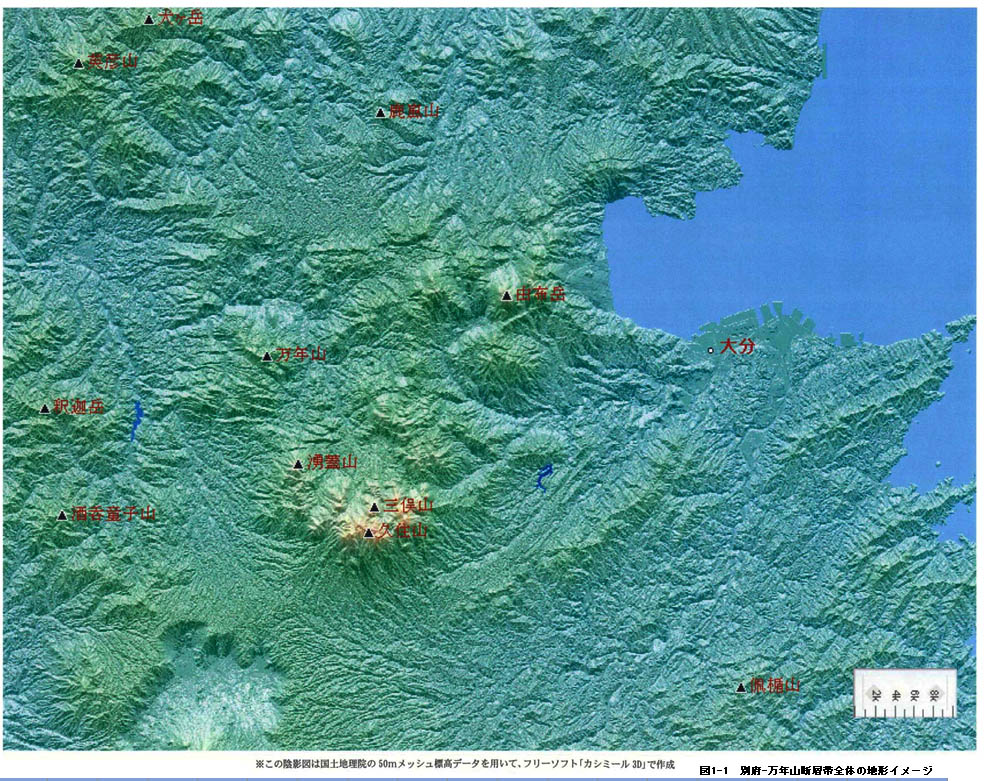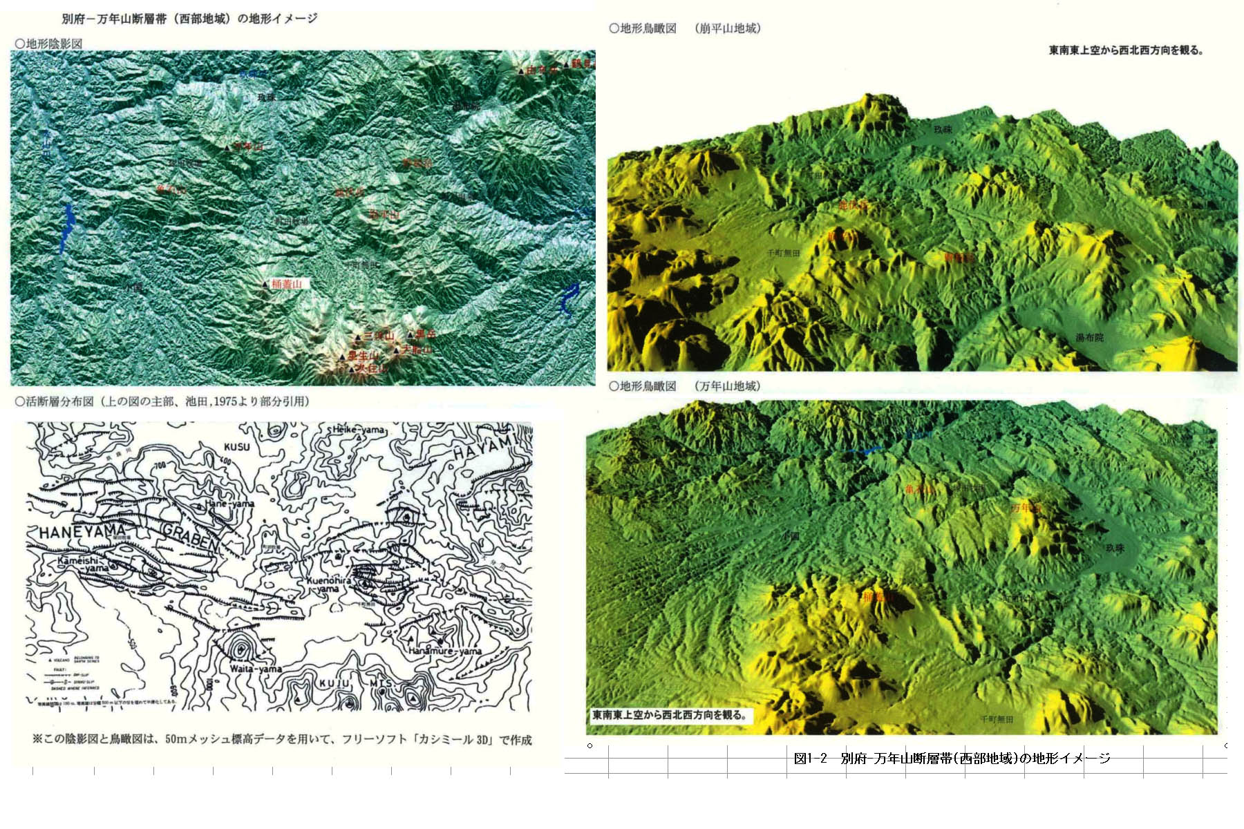 ・「別府−万年山断層帯」(松田,1990)は、中央構造線活断層系の九州への入口にあたると同時に、いわゆる「別府−島原地溝」(松本,1979など)の東部にあたり、活断層が密集するいくつかの地溝から構成されている。今回の調査地域は、この断層帯の西部地域にあたる「万年山地溝」と「崩平山地溝」の地域である(図1−1、図1−2参照)。