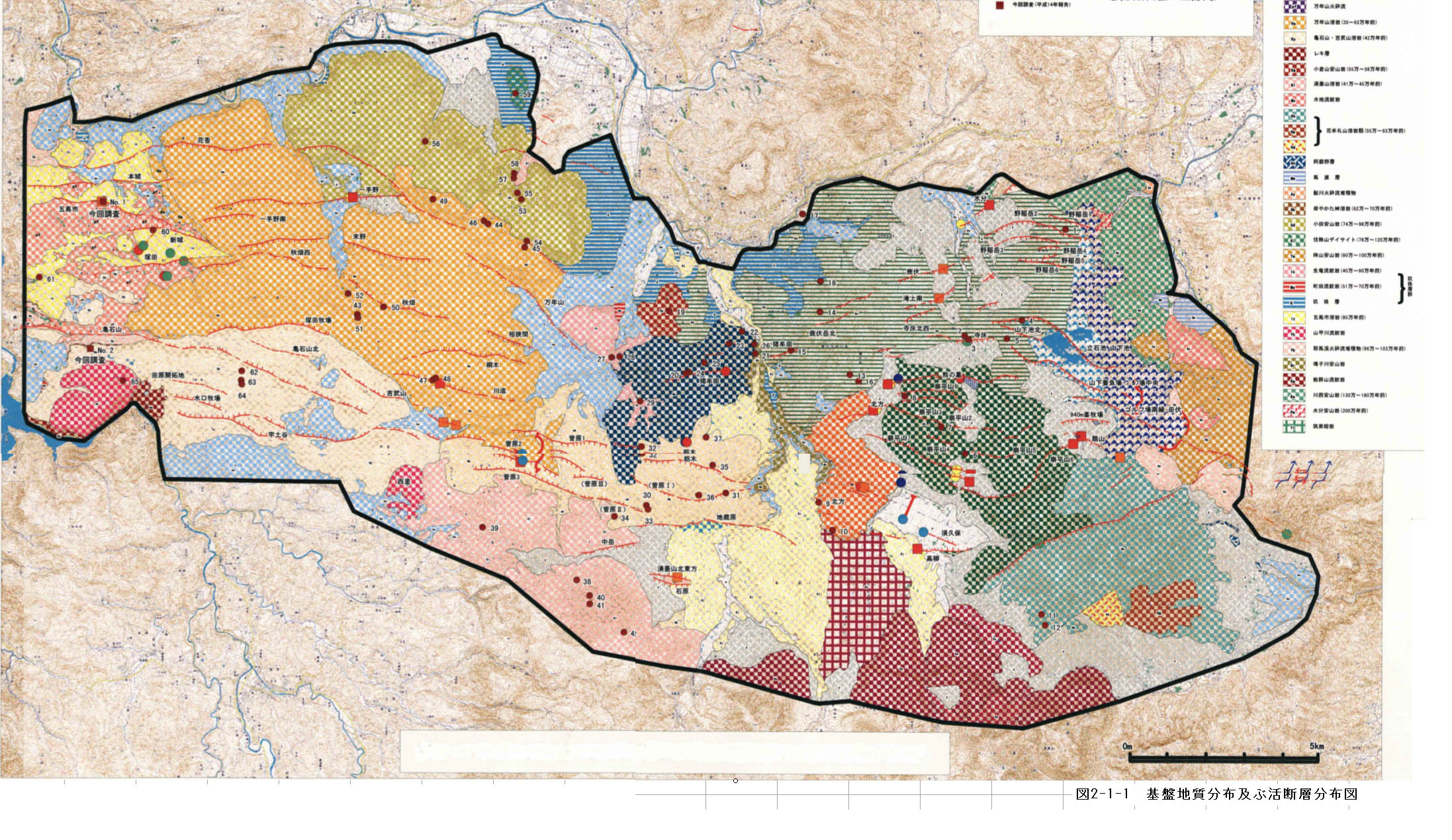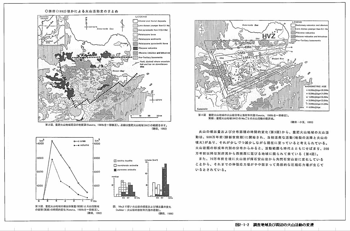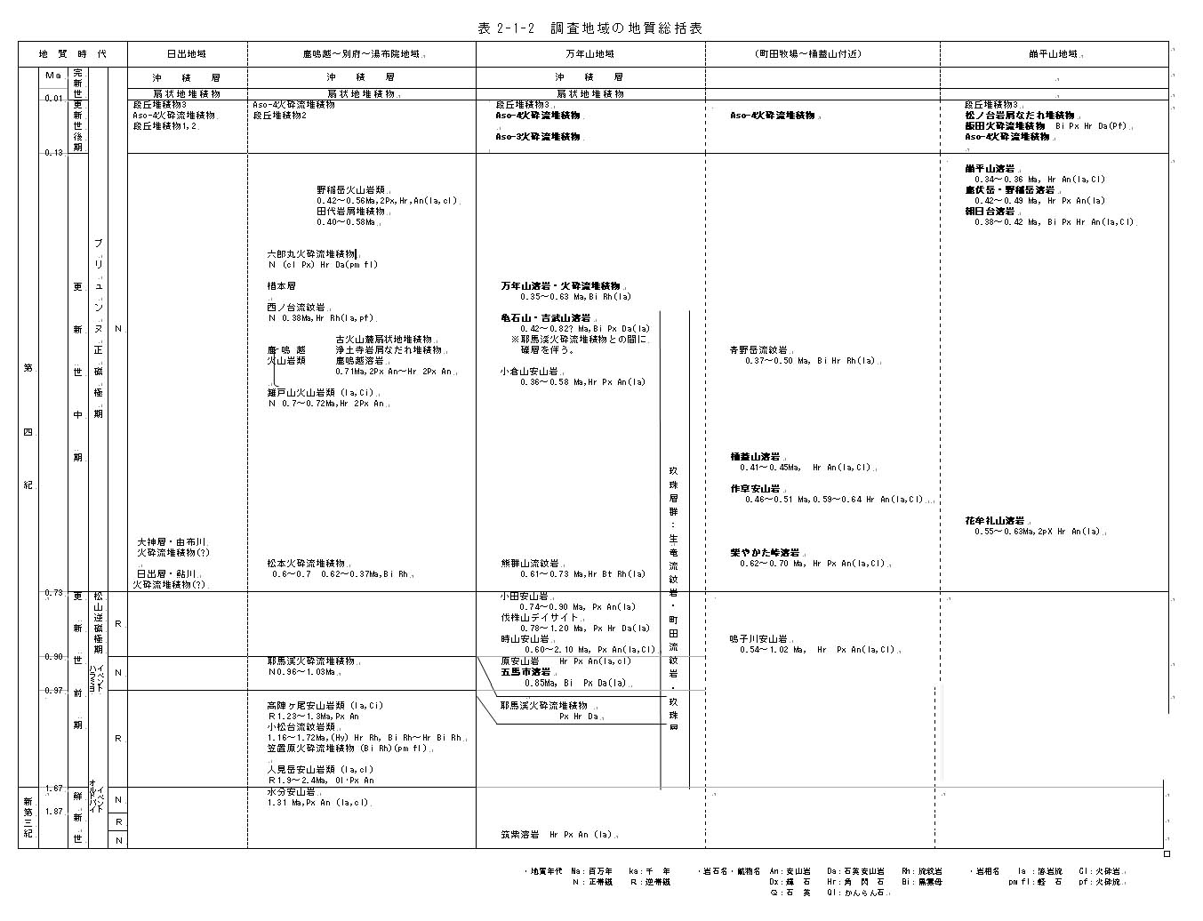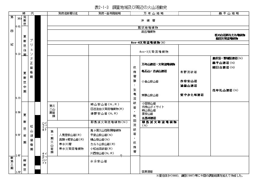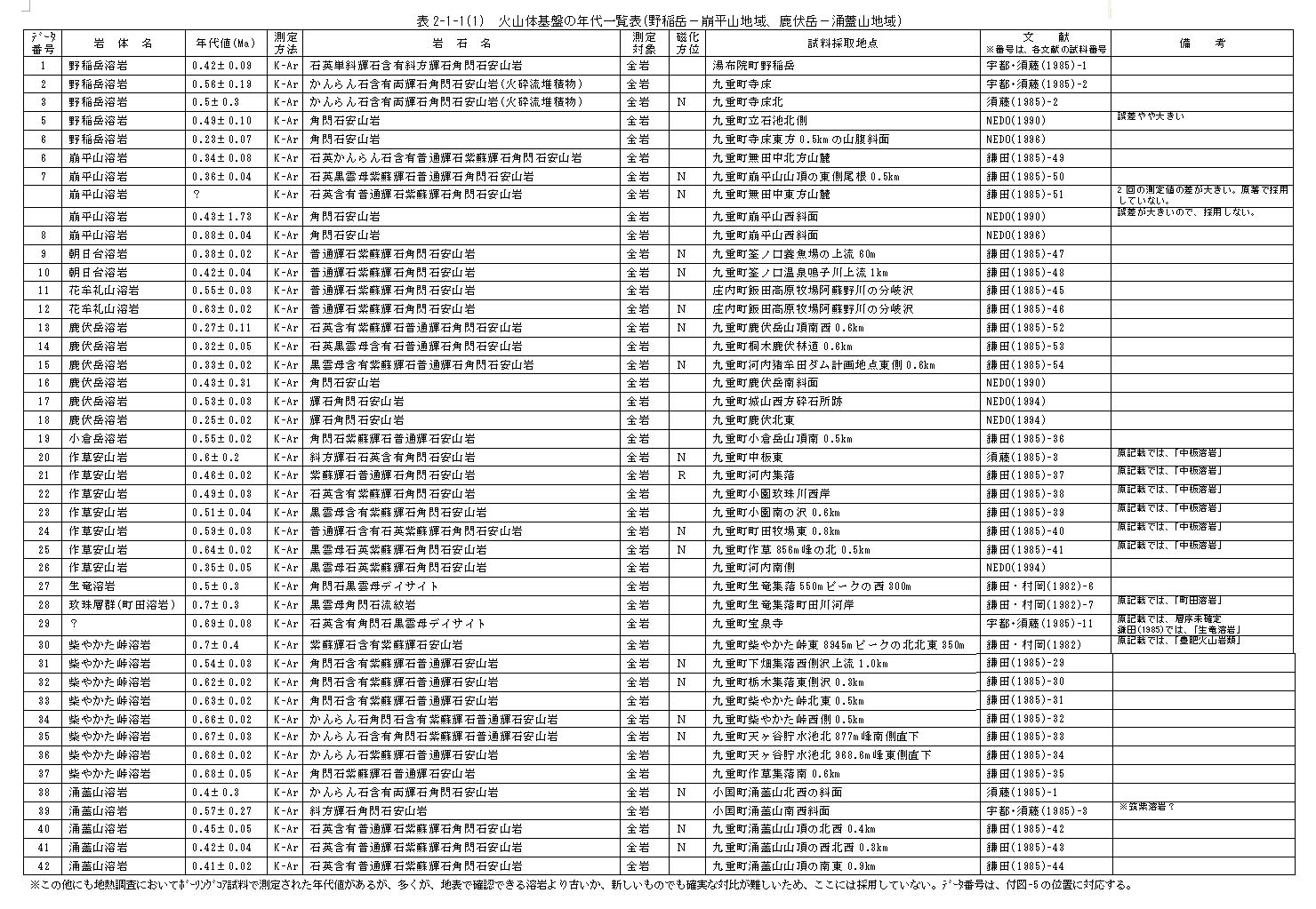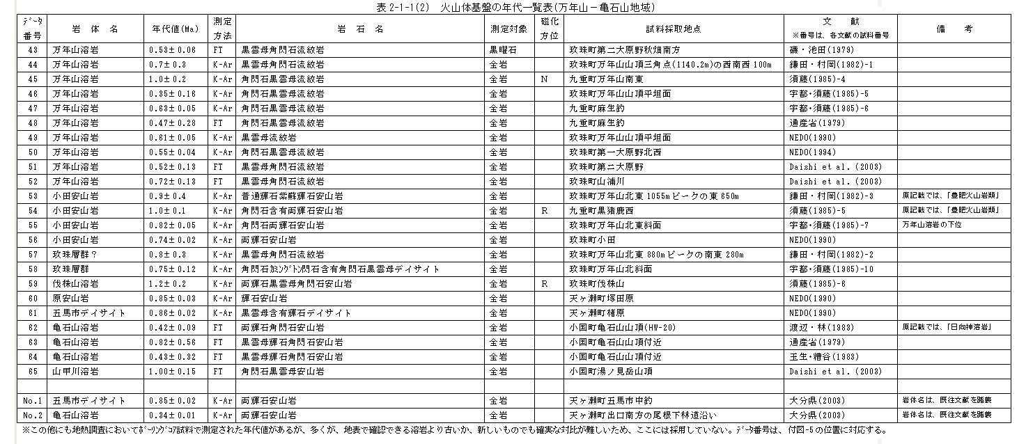 大局的にみると、調査地及び周辺の火山活動は、約500万年前に始まり、徐々に活動範囲を西から東へ狭めてきており、70万年前を境に輝石安山岩質の活動が、角閃石安山岩質の活動に変化しているとされている(鎌田・小玉,1993;図2−1−2参照)。今回の調査地域内に分布する火山岩類の年代は、最も古いもので約100万年前(耶馬溪火砕流堆積物)であり、最も新しいものは約30万〜40万年前のものである。おまかにみると調査範囲東部の崩平山地域に分布する火山岩類の年代は、西部の万年山地域に分布するものに比べて噴出年代が相対的に新しいようである。