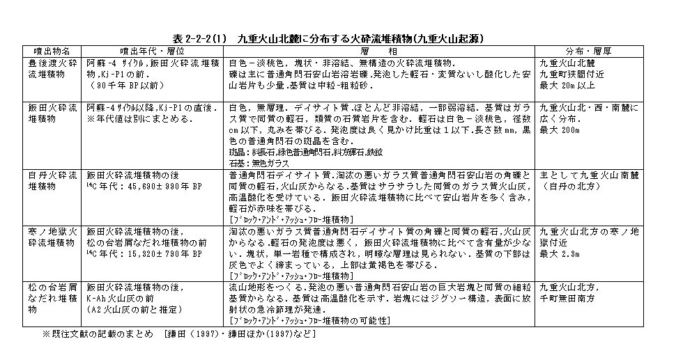 九重火山と阿蘇火山の新しい噴出物についての既往文献の記載を表2−2−1、表2−2−2−1、表2−2−2−2、表2−2−3、表2−2−4にまとめた。調査地域内では、九重火山由来と考えられる噴出物が頻繁に認められる。特に、飯田火砕流堆積物とそれと同時期とされている九重第1降下軽石層(Kj−P1)の分布が広い。完新世の火山灰も、九重火山の北麓を中心に広く分布している。また、阿蘇火山由来の噴出物としては、Aso−4火砕流(鳥栖オレンジ火砕流)堆積物に対比できる火山灰が各所に認められる。表2−2−1 九重火山の噴出物(飯田火砕流以後)