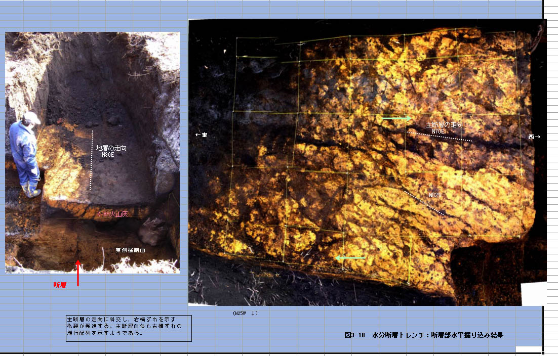 また、トレンチ調査の最終段階で、断層付近をK−Ah火山灰層準で水平方向に掘削し、断層と周辺のクラックの分布を観察したところ、断層の走向に斜交し、右横ずれを示すクラック分布が確認された(図3−10)。