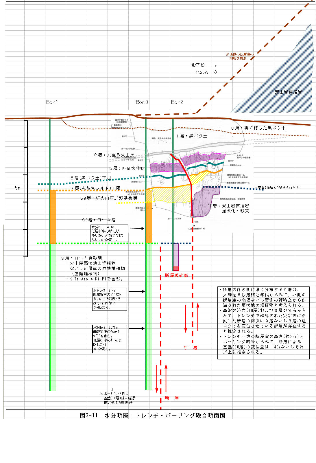 なお、ボーリングNo.2、No.3での基盤の溶岩(10層)および9層の分布からみて、トレンチで確認された完新世に活動した断層の南側に近接して、9層ないし8層の途中までを変位させている断層が存在し、これらの断層により、基盤上面は階段状に南側へ落ちていると推定される(図3−6)。