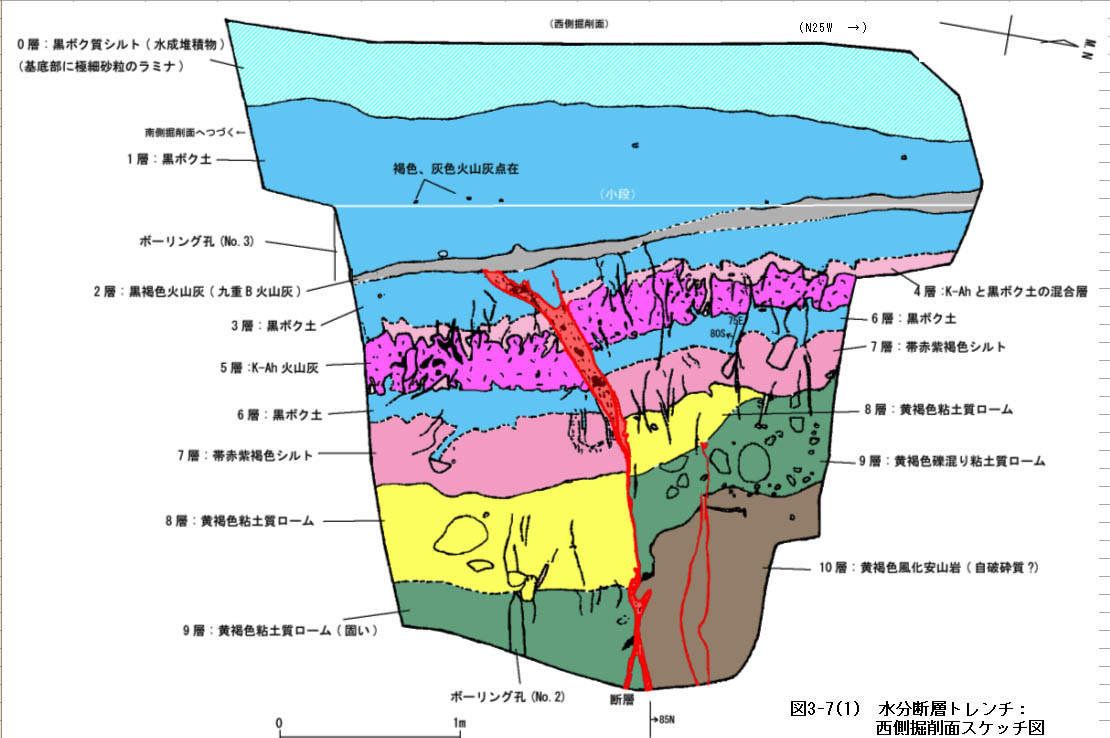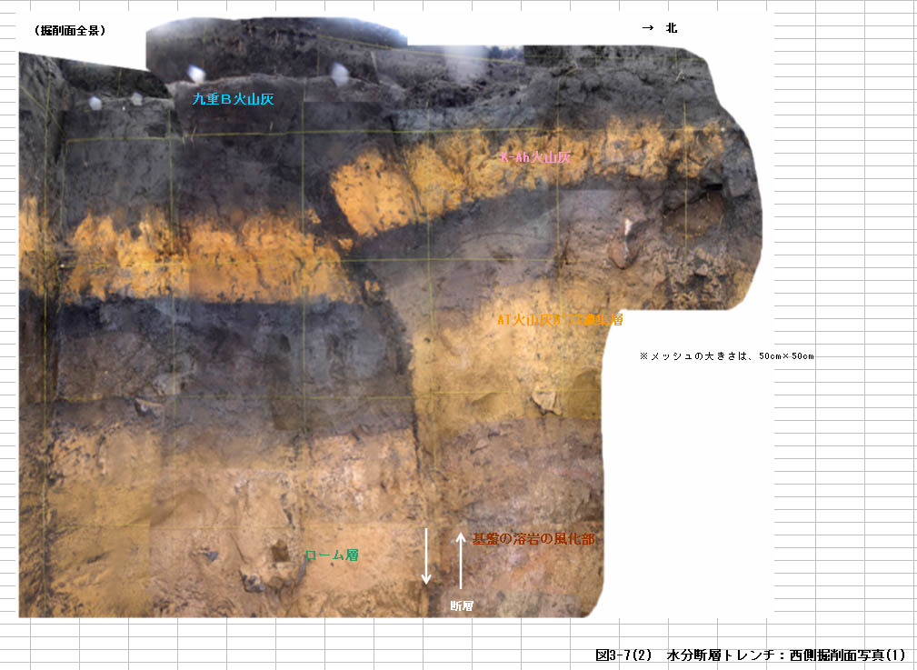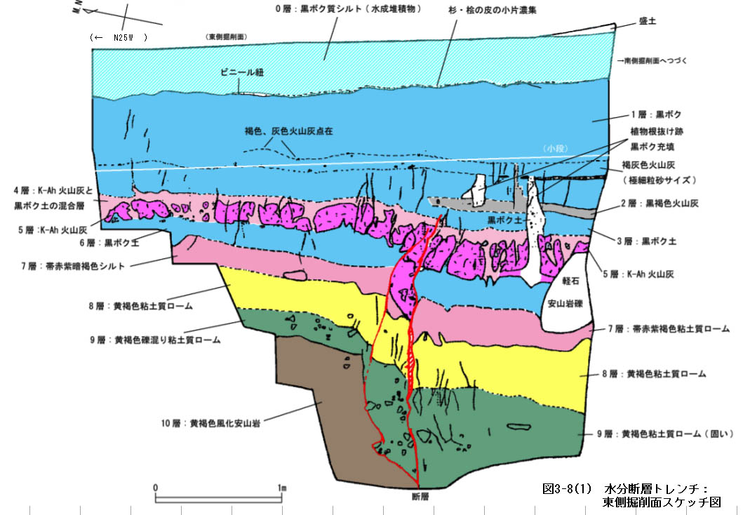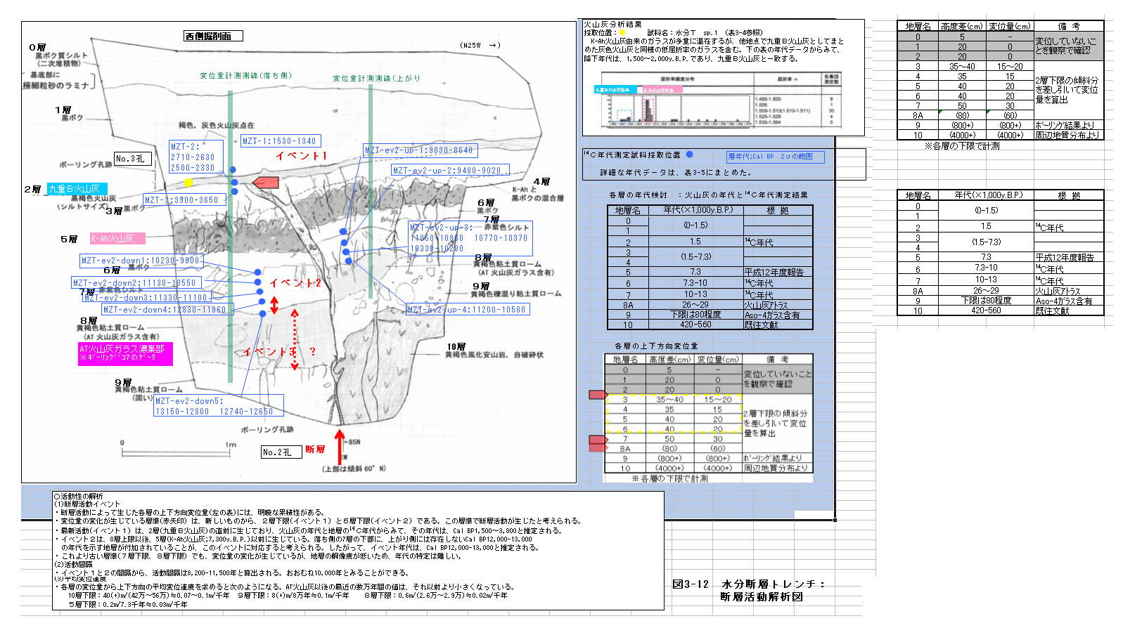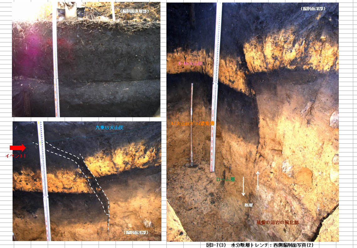 表3−5に示したように、2層下限を境にして、変位量が変化し、0〜2層は、断層による変位を受けていない。変化量は、15〜20cmで、断層落ち側での3層の層厚の増加として表れている。また、トレンチ西側掘削面にみられる断層(図3−7−1、図3−7−2、図3−7−3参照)は、3層の最上部まで連続し、2層に覆われており、東側掘削面でも、2層下限より上位の層には、断層付近の亀裂が達していない。これより、最新の断層活動は、2層(九重B火山灰)が堆積する直前に生じたと推定される。