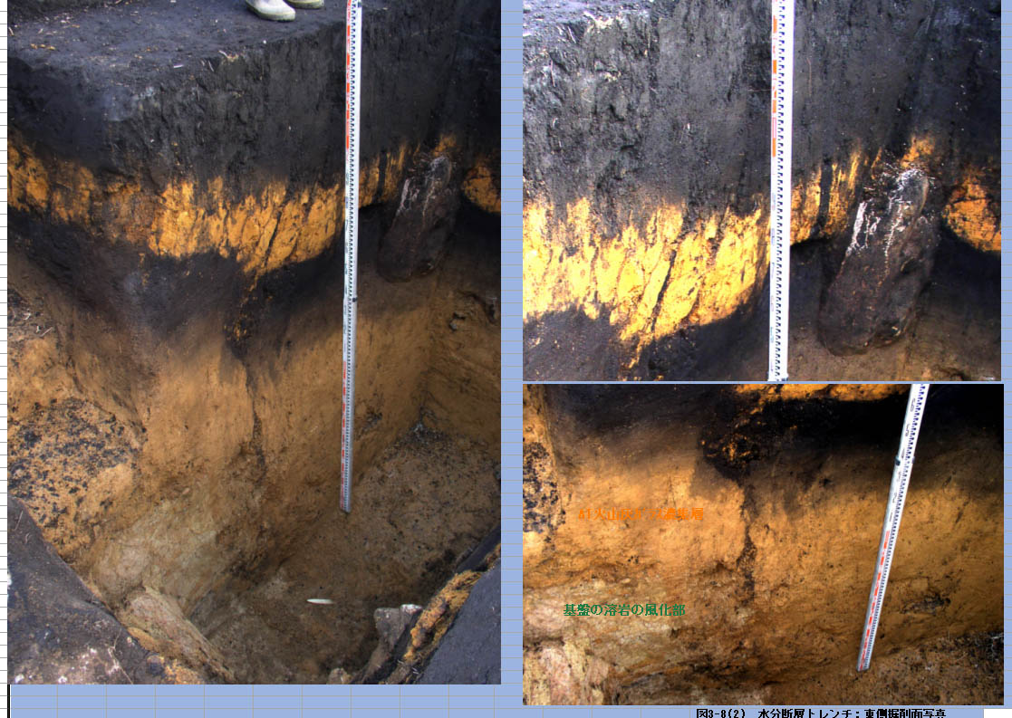 ボーリング、トレンチで確認された地層は、基盤の野稲岳火山溶岩とそれを覆う礫質の火山麓扇状地堆積物、ローム層と黒ボク土であり、その中に火山灰が挟まれている(図3−6、図3−7−1、図3−7−2、図3−7−3、図3−8−1、図3−8−2、表3−3〜表3−4、ボーリング柱状図とコア写真は、巻末資料として添付)。