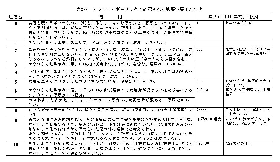 表3−3 トレンチ・ボーリングで確認された地層の層相と年代