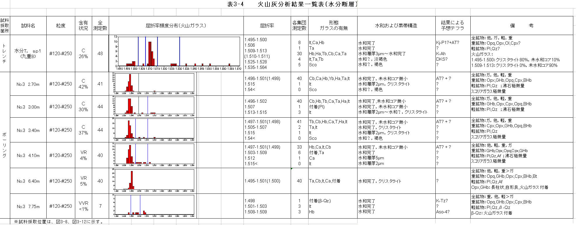 全体に礫質であるが、No.3孔の下記の深度で分析したところ、基質中に広域火山灰に由来する火山ガラスが含まれていることが確認された(表3−4参照)。ただし、いずれもかなり微量であり、火山灰の純層ではない。