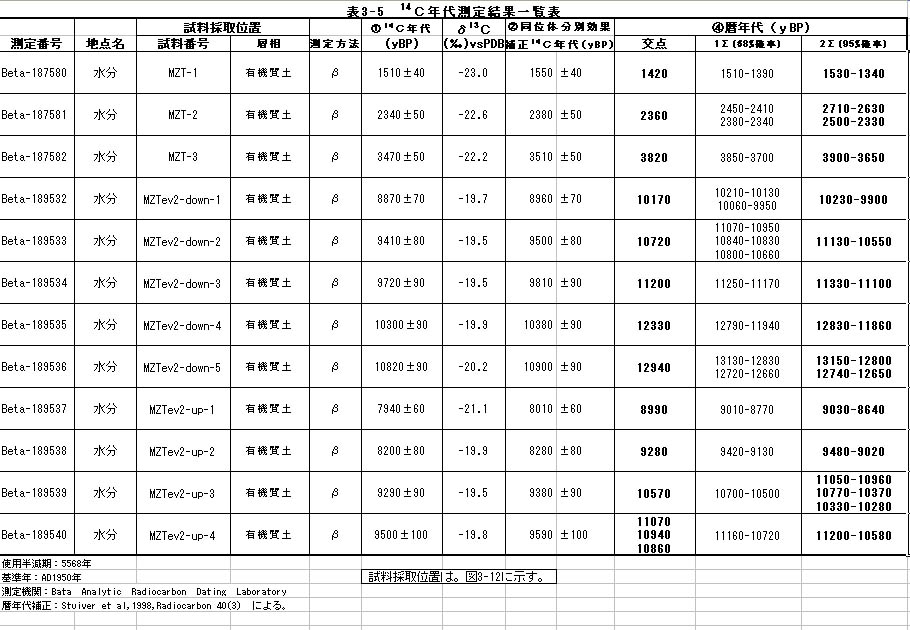 火山灰の年代と地層の14C年代からみて、年代は、Cal BP1,500〜3,800である。