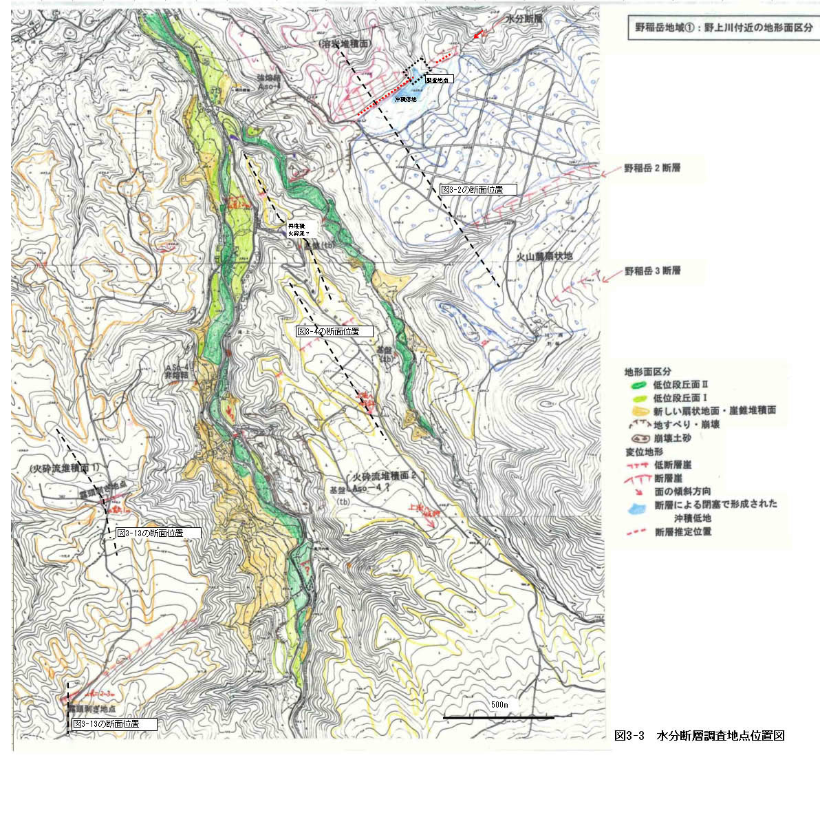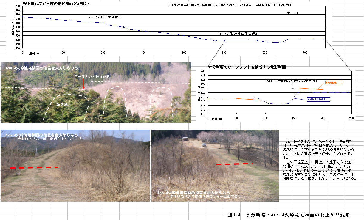 野上川支流右岸の断層崖の西方延長部では、大規模な崩壊が生じているため、断層の延長部にあたる変位地形は確認できない。野上川本流と支流の間の、Aso−4火砕流堆積物から構成されていると推定される尾根では、断層崖の延長部付近に南側が下がった鞍部が認められる(図3−4)。比高は6mである。さらに西では、Aso−4火砕流が浸食されて形成されたと考えられる、野上川右岸の河岸段丘上に、断層崖の可能性がある上流側(南側)落ちの比高1〜1.5mの段差が認められる。これらは、断層変位地形ないしその可能性がある地形と考えられる。ただし、断層の存在は確認できていない。これより西方では、変位地形の可能性がある地形は確認できない。