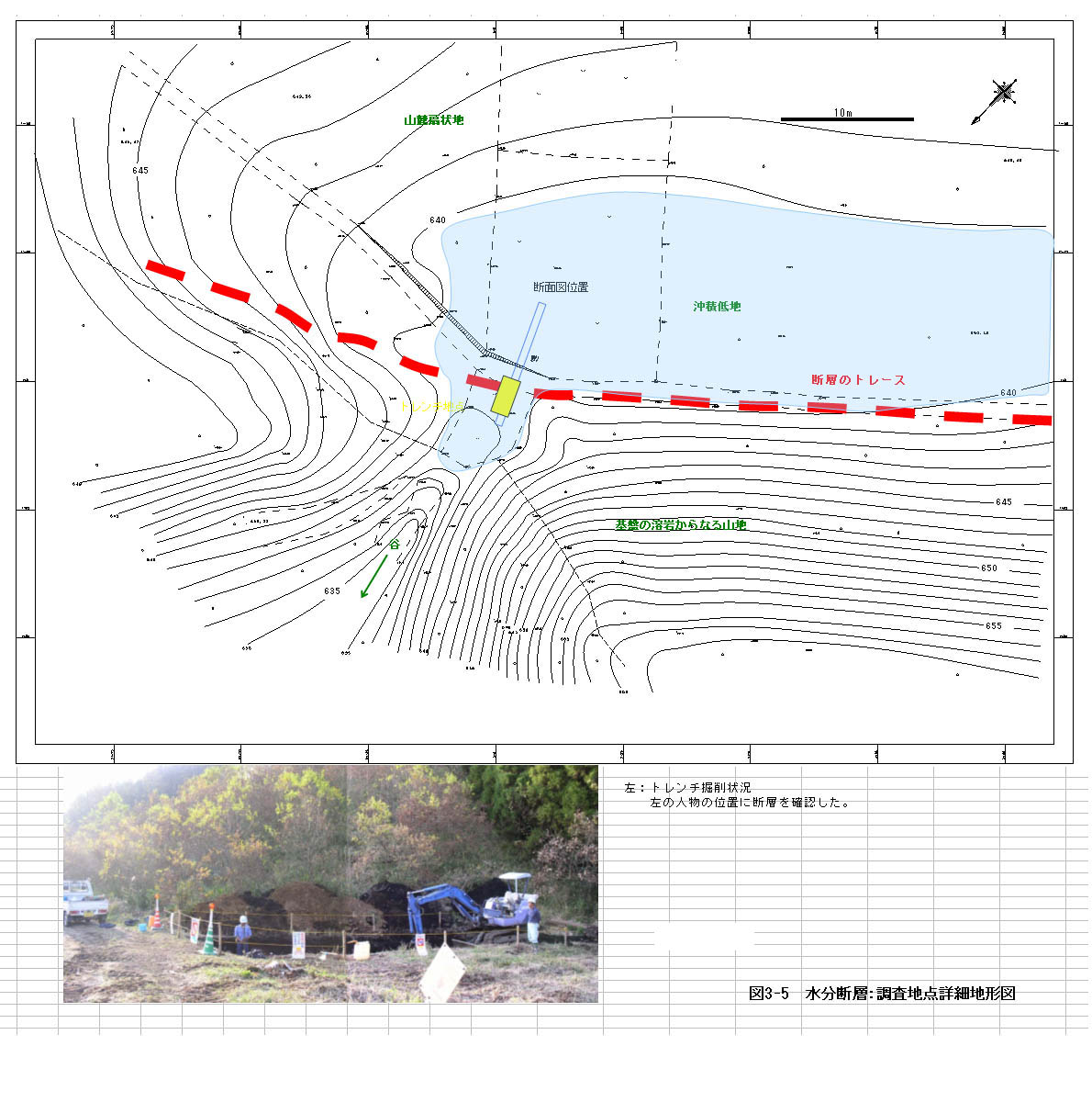 一方、東方では、標高758mのピーク付近まで、トレンチ地点の断層崖の延長がみられるが、それより東では、変位地形は確認できない。