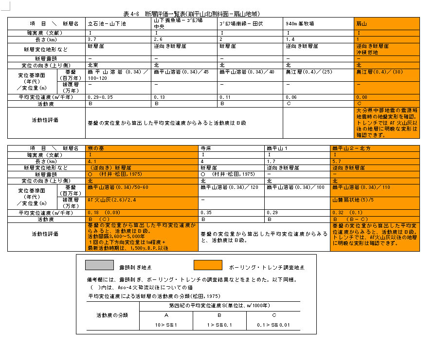 算出した上下方向の平均変位速度から判断される活動度がB級である。その中でも、熊の墓断層では、AT火山灰以後ないし完新世の断層活動が確認されたが、崩平山2−北方断層では、AT火山灰以後の断層活動は、確認できなかった。また、扇山断層は、活動度がC級であり、最近は明瞭な地層の変位は伴った断層活動は生じていないものの、マグニチュード6クラスの大分県中部地震の震源になった可能性がある。