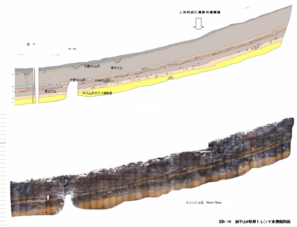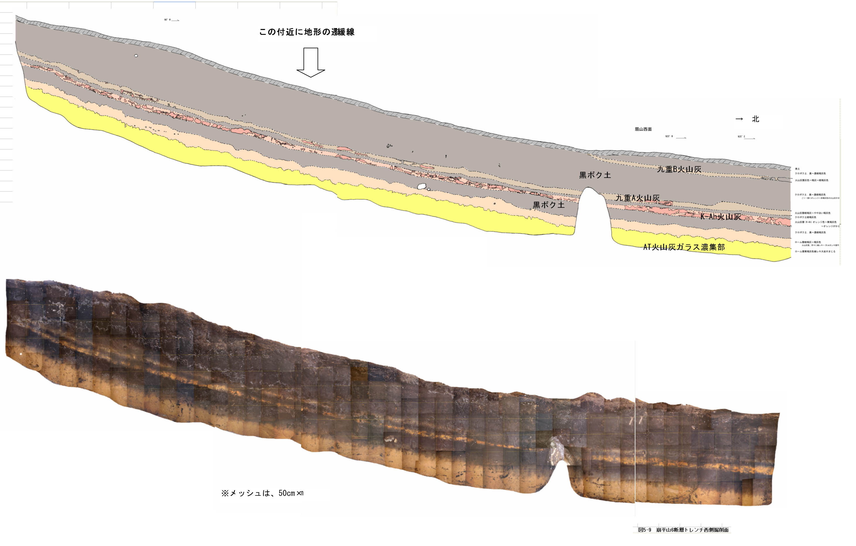 トレンチは、断層が通過すると推定された地形の傾斜変換点の位置を横断し、地表からの深さ3〜3.5mまで掘削した(図5−8)。確認された地層は、厚い黒ボク土層とその下位のローム層である。黒ボク層は、橙色スコリア層、九重A火山灰層、K−Ah火山灰層を挟み、ローム層最上部には、AT火山灰由来のガラスが濃集している。