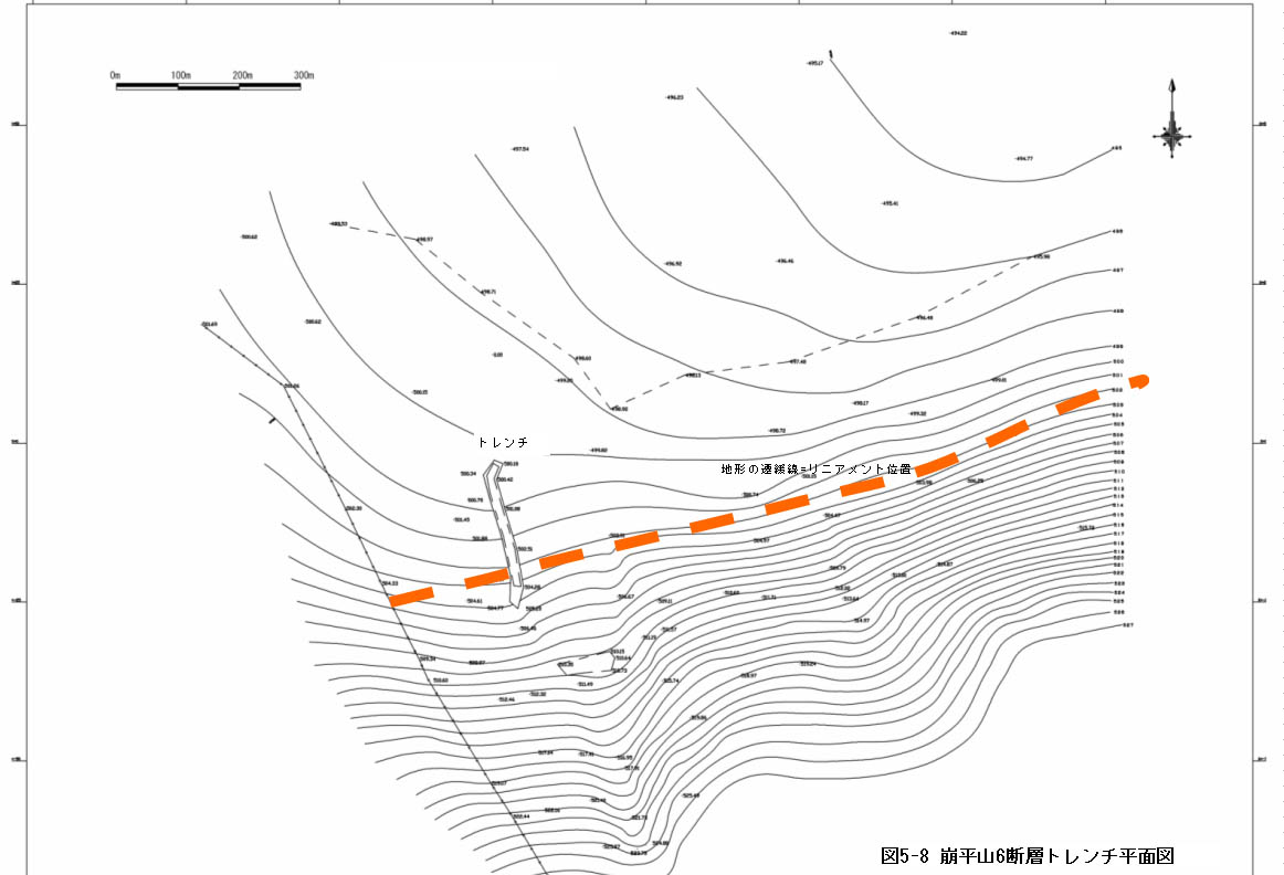 このトレンチでは、AT火山灰以降の層準に明瞭な変位を与えている断層は確認できなかった(図5−9、図5−10)。他地点の調査結果と同様に考えると、この断層では、AT火山灰層準以後に、地層に明瞭な変位を与えるような断層活動は生じていないと判断される。