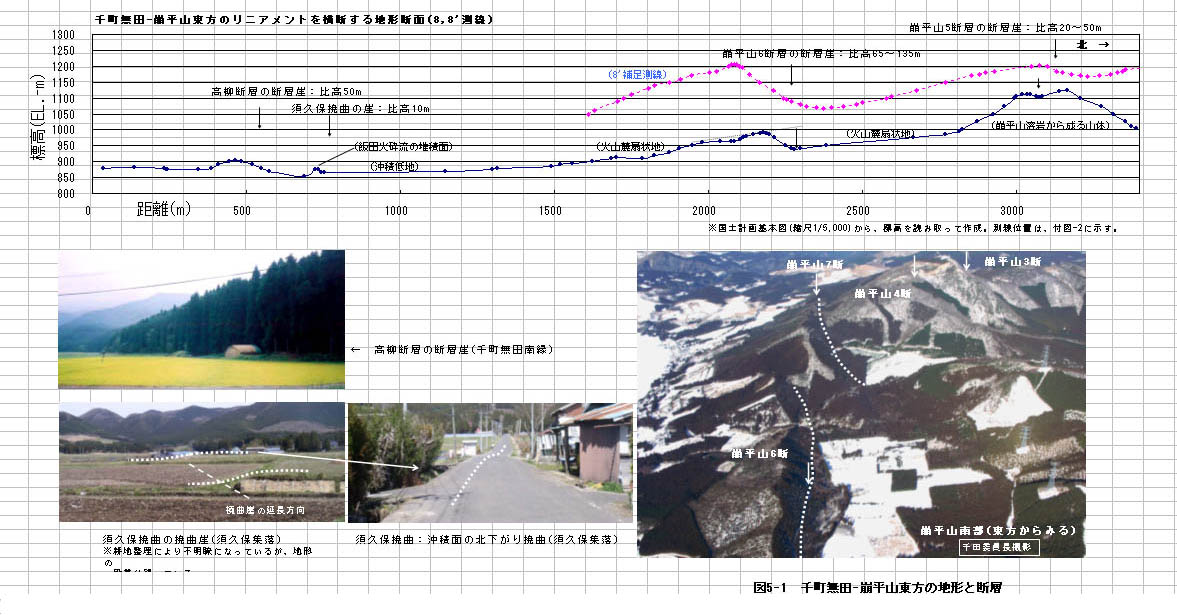 既往文献データをもとにした、本地域の断層についての地形的な評価を表5−1にまとめた。今回実施した空中写真判読結果を付図2に、国土計画基本図ないし森林基本図(縮尺1/5,000)から作成した主要部分の地形断面を図5−1、図5−2及び前出の図4−3に示す。