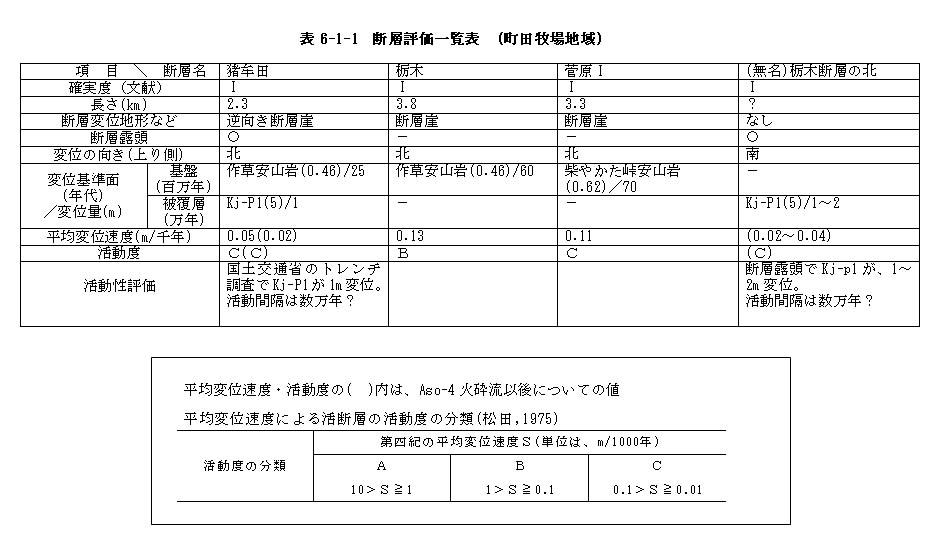 表6−1−1 断層評価一覧表 (町田牧場地域)