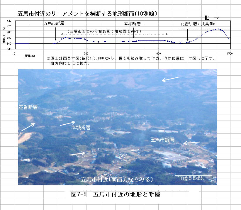 図7−6 五馬市断層の断層崖付近の地質分布(露頭剥ぎ、ハンドオーガーボーリング結果)