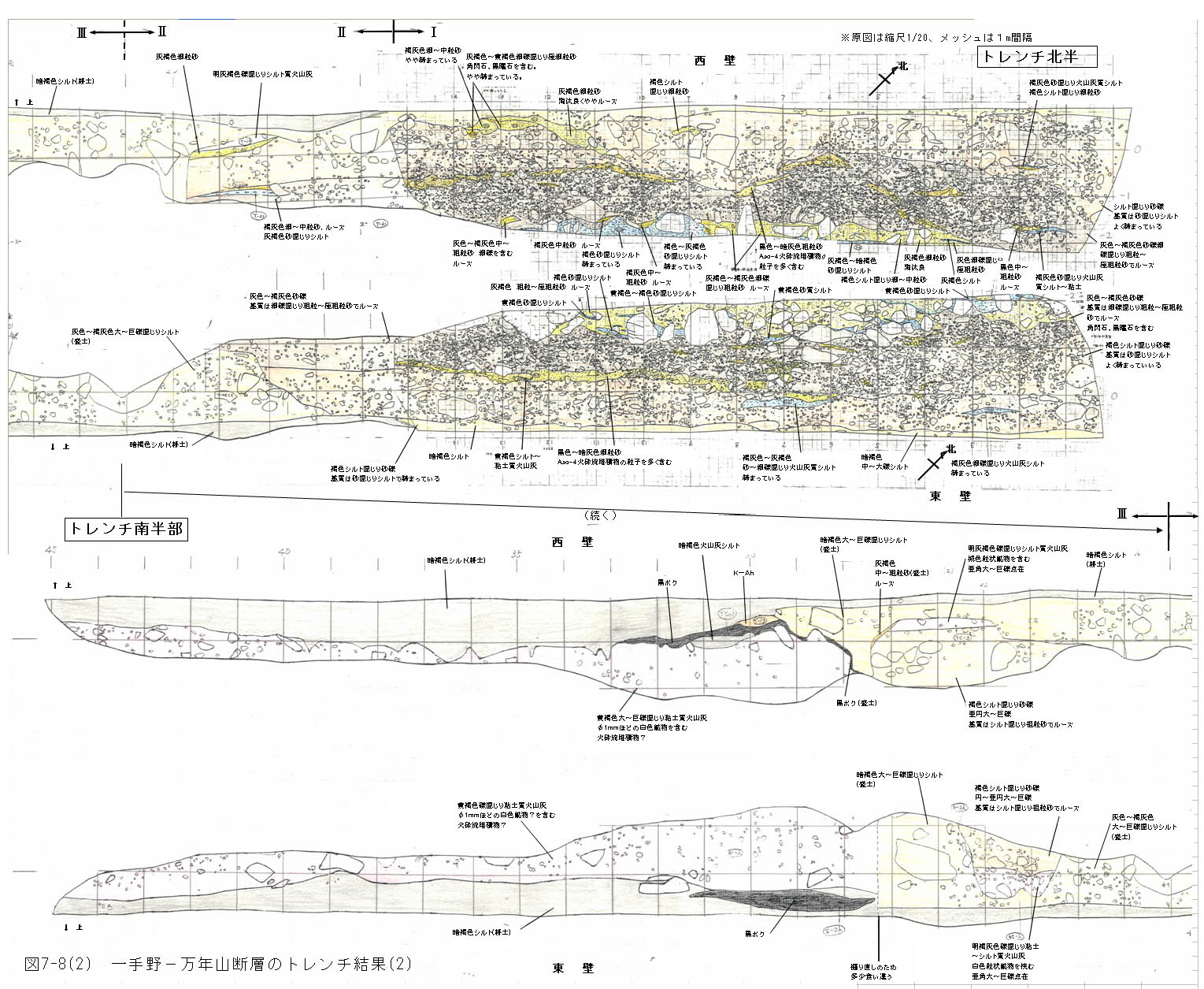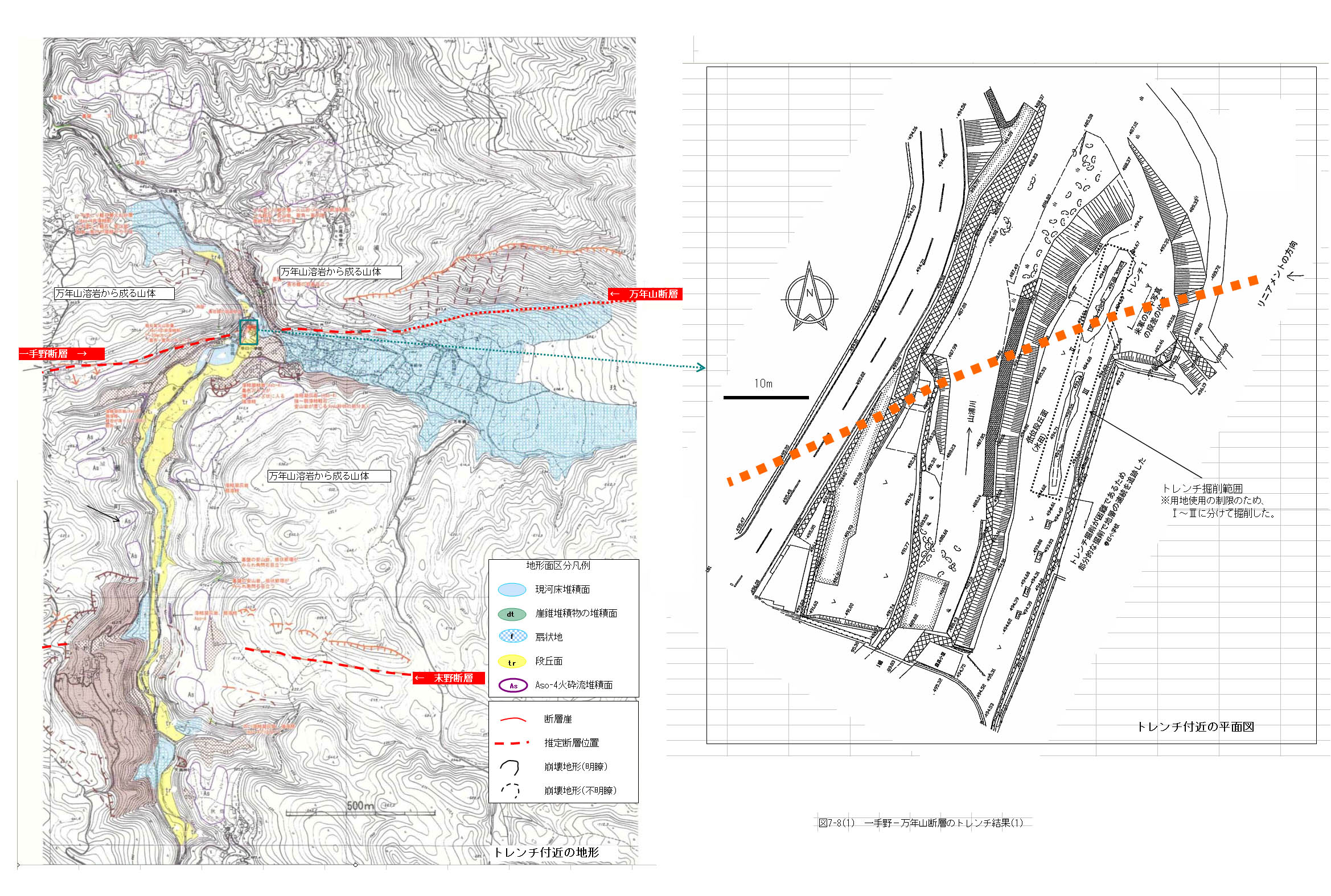 また、一手野−万年山断層のリニアメントの延長部が山浦川を横断する位置に、米軍撮影の古い空中写真で低位段丘面上に南落ちの段差が認められた。この段差が北上りの断層活動によって生じたものであるならば、Aso−4火砕流堆積物以後の新しい時代に断層活動があったことになる。この点を確認するために、平成14年度に、この段差があった地点でトレンチ調査を実施した(図7−8−1、図7−8−2)。しかしながら、この段差に相当する位置では、段丘面の構成層を変位させている明瞭な断層は確認できなかった。これより、この段丘面の形成以後に断層活動が生じた可能性は低いと判断された。当初段丘面上の変位地形と想定した地形的な段差は、側方の谷からもたらされた巨礫が谷の狭隘な部分でトラップされた結果生じたものである可能性が高いようである。