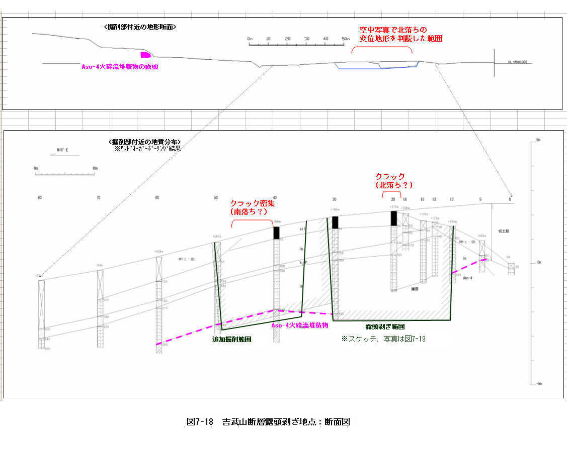 この作業により、Aso−4火砕流堆積物の上面に、地形と同様のグラーベン状の凹部が存在することが確認された。地質分布から推定されるAso−4火砕流堆積物の変位量は、上下方向で12.5mとなる。