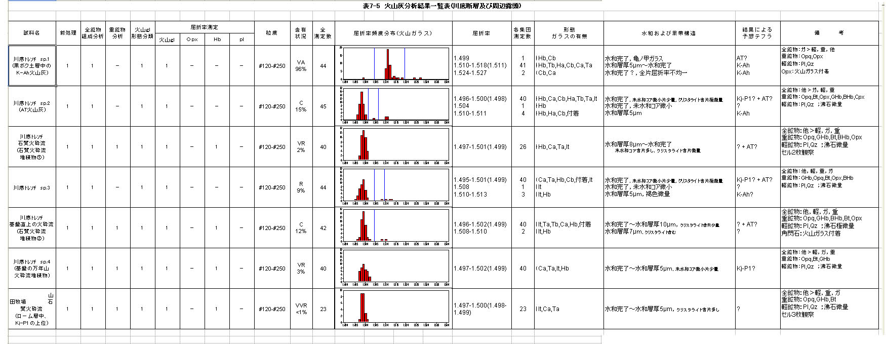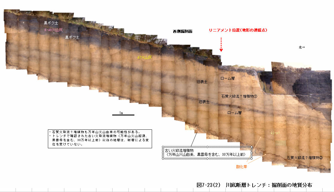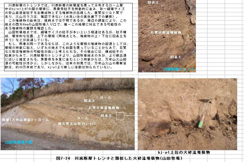 トレンチでは、万年山火砕流堆積物とそれを覆うKj−P1、AT火山灰を挟むローム層が確認された(図7−23−1、図7−23−2、表7−5、表7−6)。ローム層中には、Kj−P1とAT火山灰の間に、旧表土に挟まれて礫質の堆積物が出現した。この堆積物は、岩質的にはほぼ均一で、安山岩質の粒子を主体とする。ほぼ塊状で堆積構造は認定しがたい(下部から上部に向かって、シルト質→砂質→シルト質という変化を示すこともある)。わずかに含まれる火山ガラスは、形態や屈折率が、万年山火砕流堆積物ときわめて類似している(表7−5)。この地点の西方約3km(山田牧場進入路;前出)でも、同じ層準に同様の堆積物がみられる(図7−24)。このような分布と産状からみて、この堆積物は、トレンチ地点付近に局所的に分布する堆積物ではなく、万年山地域にある程度の範囲で分布する、火砕流堆積物であると判断される。