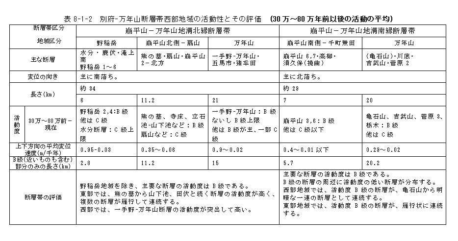 表8−1−2 別府−万年山断層帯西部地域の活動性とその評価 (30万〜80万年前以後の活動の平均)