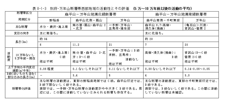 表8−1−3 別府−万年山断層帯西部地域の活動性とその評価 (5万〜10万年前以後の活動の平均)