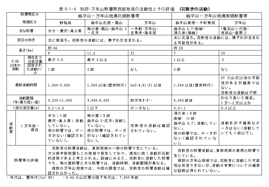 西部の万年山地域では、活動履歴についての確実なデータが得られていないが、東部の崩平山、野稲岳地域に比べて、完新世になってからの断層活動は活発ではないようである。完新世の断層活動は、東部地域の一部の断層に集中して生じており、大分県中部地震もこの地域で生じている。