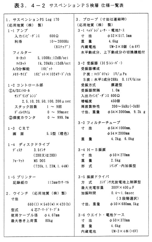 サスペンションPS検層は、ダウンホール法PS検層とは異なり、孔中で起振と受振を行う。測定系は、図3−4−2の概念図に示すように、@振源と2組の受振器が組み込まれたゾンデ部、A波形記録・制御機能を有する地上装置、Bゾンデを移動させるためのケーブルウインチからなる。