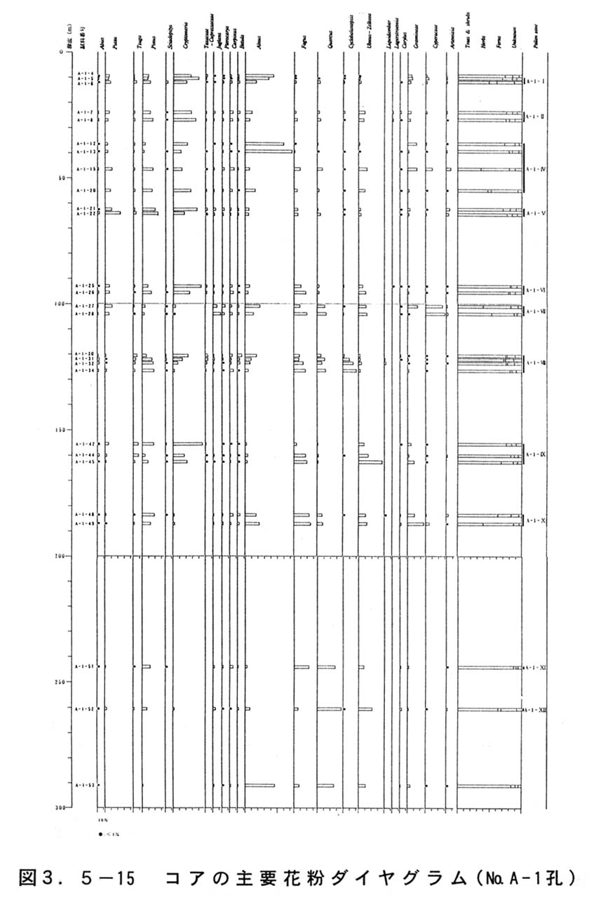 Cryptomeria,Picea,Pinusが高率である。Ulmus−Zelkova,Fagus,Quercusなども5〜10%産出する。