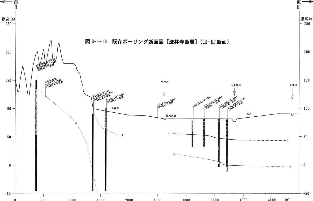 この付近はデータに乏しく詳細はわからないが、大まかにボーリング柱状図の地質境界、および電気検層結果による類似パターンをつないでみると、各地層は丘陵地に向かいその分布深度が浅くなるようにも思われる。