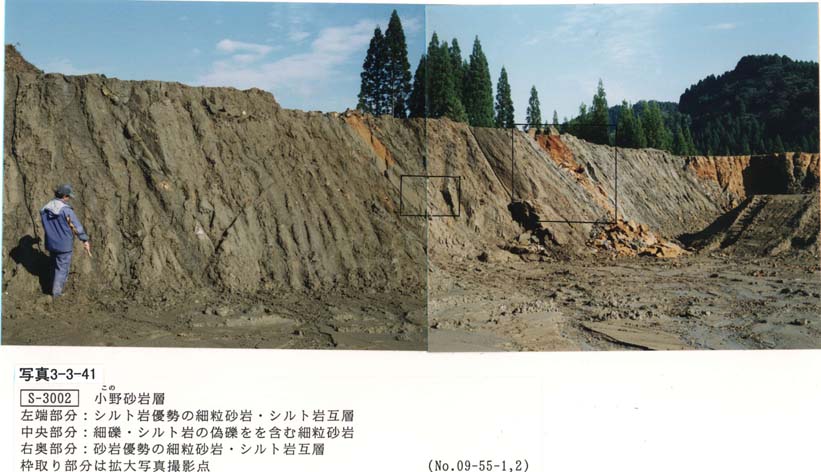細粒砂岩・砂質シルト岩が卓越する岩相であるが、シルト岩ないし泥岩をはさんだり(O−2804:写真3−3−47,O−2821:写真3−3−48,O−2822:写真3−3−49)、硬質のシルト岩・砂岩の薄互層(O−2817:写真3−3−50,O−2813:写真3−3−51)をなす部分もある。しかし、その連続を確認するには到っていない。細粒砂岩は固結度に差があり砂層状を呈する所もあるが、東に急傾斜していることで第四紀の砂層と区別できる。一部に軽石凝灰岩をはさむ(O−2814:写真3−3−52)が、その連続性は確認できなかった。