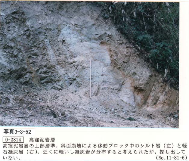 なお、1/50,000石動図幅(1989)によると、ここで高窪泥岩層として示した地質は下位より音川累層の最下部泥岩層、島倉泥岩砂岩互層、西広谷砂岩層、下部泥岩層、浦田砂岩層及びその相当層、中部泥岩層(神代凝灰質砂岩層含む)、小久米砂岩層及びその相当層、上部泥岩層に細分されておりシルト質泥岩が過半を占めるとされている。しかし、踏査によれば細粒砂岩〜砂質シルト岩が卓越し、砂がちと判断され、石動図幅の様にシルト質泥岩を砂岩のはさみ層によって細分することは不可能と判断し、子撫川以南の音川累層であり、子撫川以南に分布し、岩相が類似している高窪泥岩層として一括した。