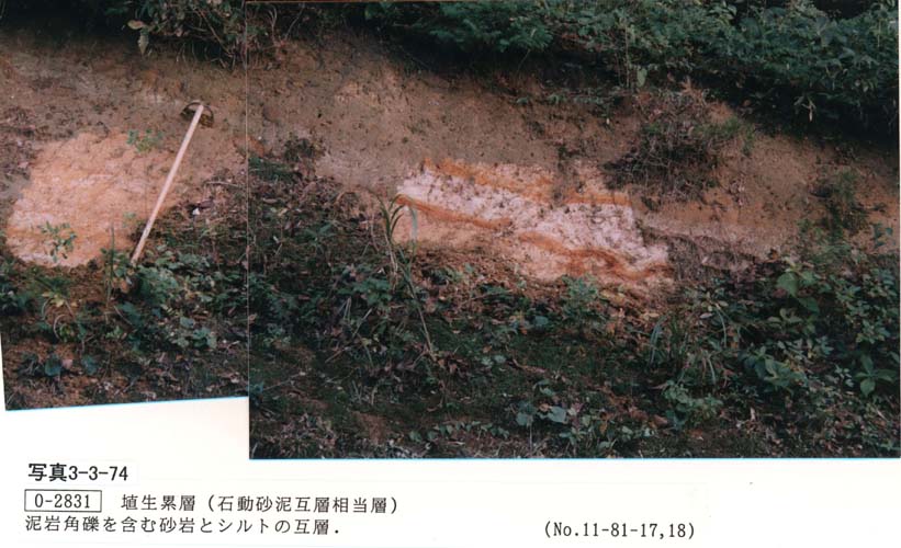なお、浅井神社周辺のF−2803(写真3−3−77)で頭川砂岩層を傾斜不整合に覆って分布する第四系は層相の類似性から、埴生累層(石動砂泥互層相当層)と判断した。