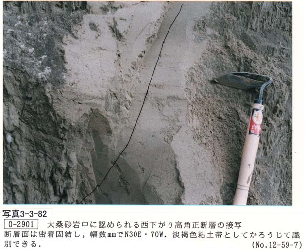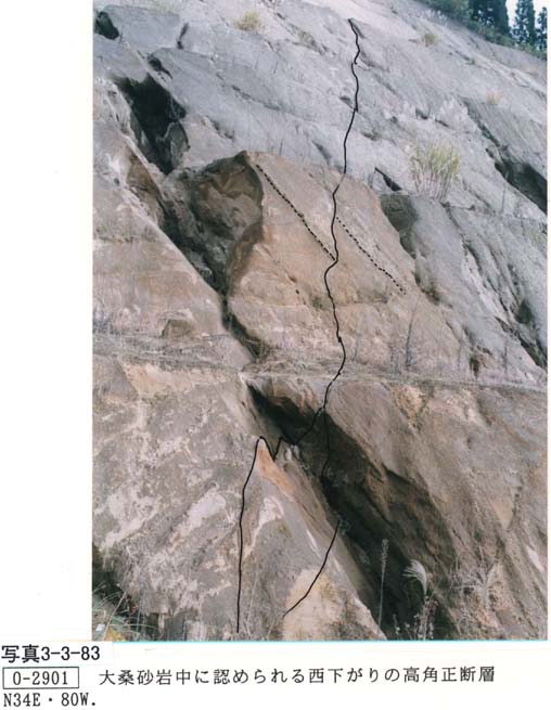リニアメントBに近接したO−2901(写真3−3−80,写真3−3−81,写真3−3−82,写真3−3−83,写真3−3−84)において、東へ傾斜する大桑砂岩層をひきずりを残さず高角度で切る平野側上り(東側上がり)約5mのN30゚E/70゚Wの断層が認められる。この断層は面が癒着していることから、この活動は古いと考えられ大桑層が東傾斜した際あるいはその直後に平野側上りで形成されたと想定する。