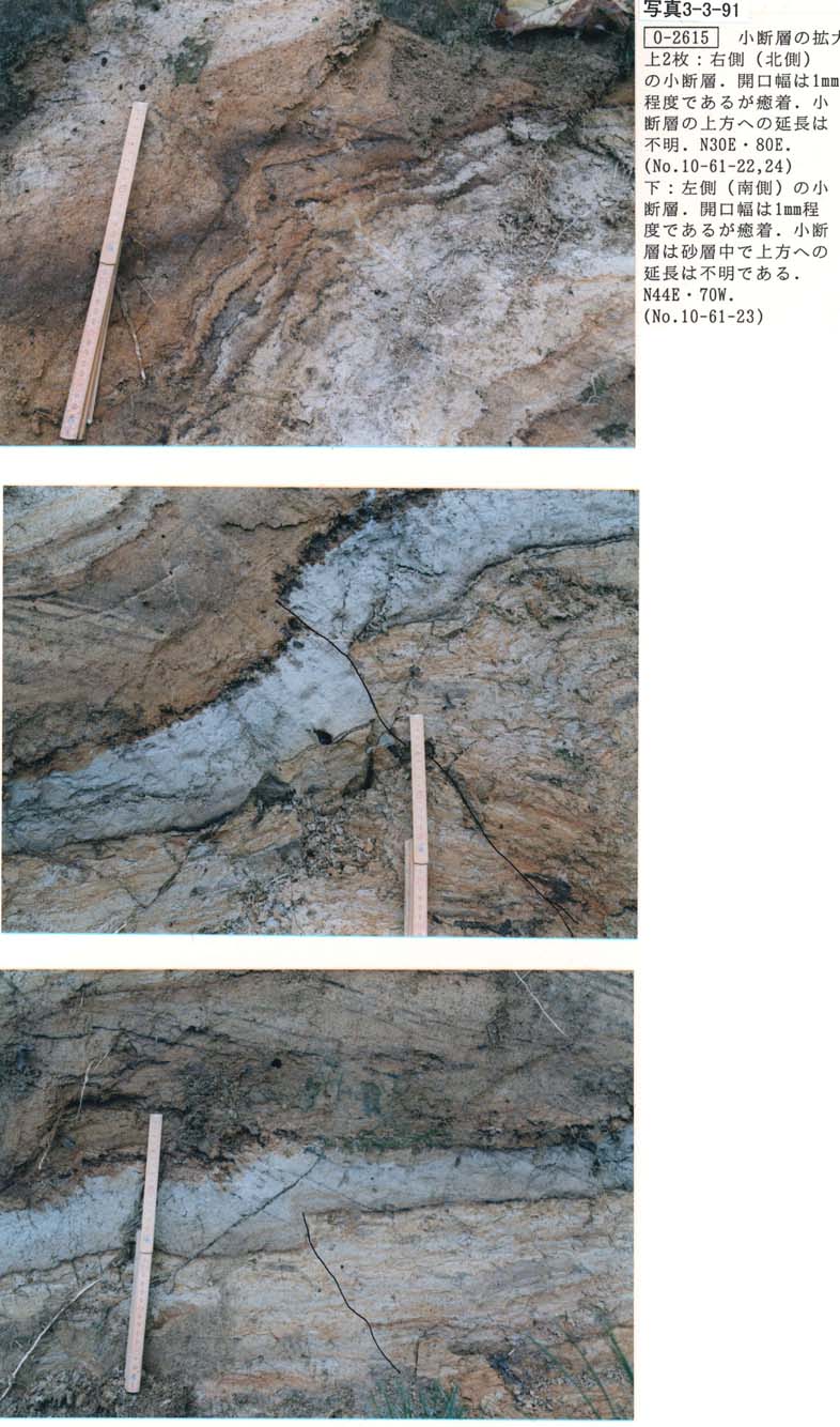 推定断層の東側の低平な丘陵頂部においてO−2615(写真3−3−90,写真3−3−91,写真3−3−92)で2つの逆断層露頭と2つの正断層露頭が発見された。