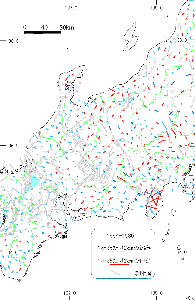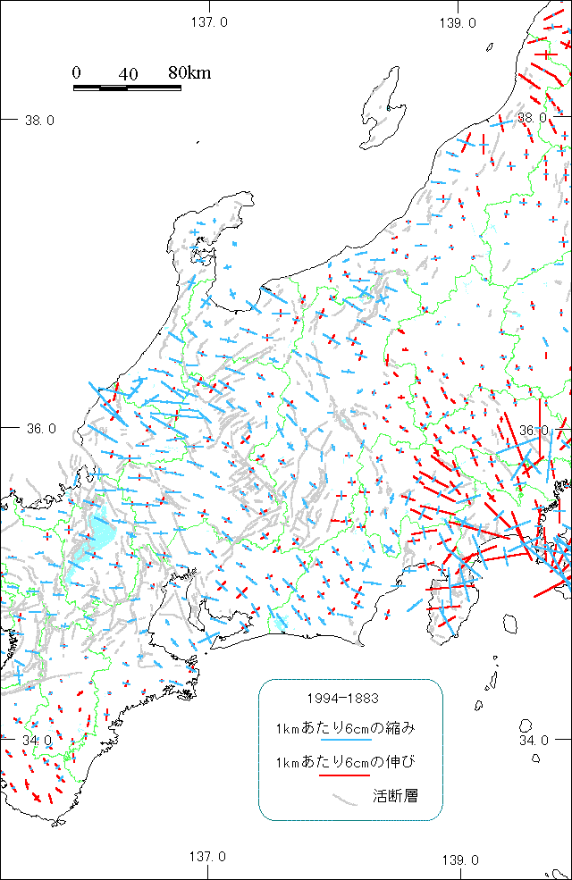 糸魚川−静岡構造線以西では、全体的に北西−南東方向ないしは東西方向の縮みが見られる。