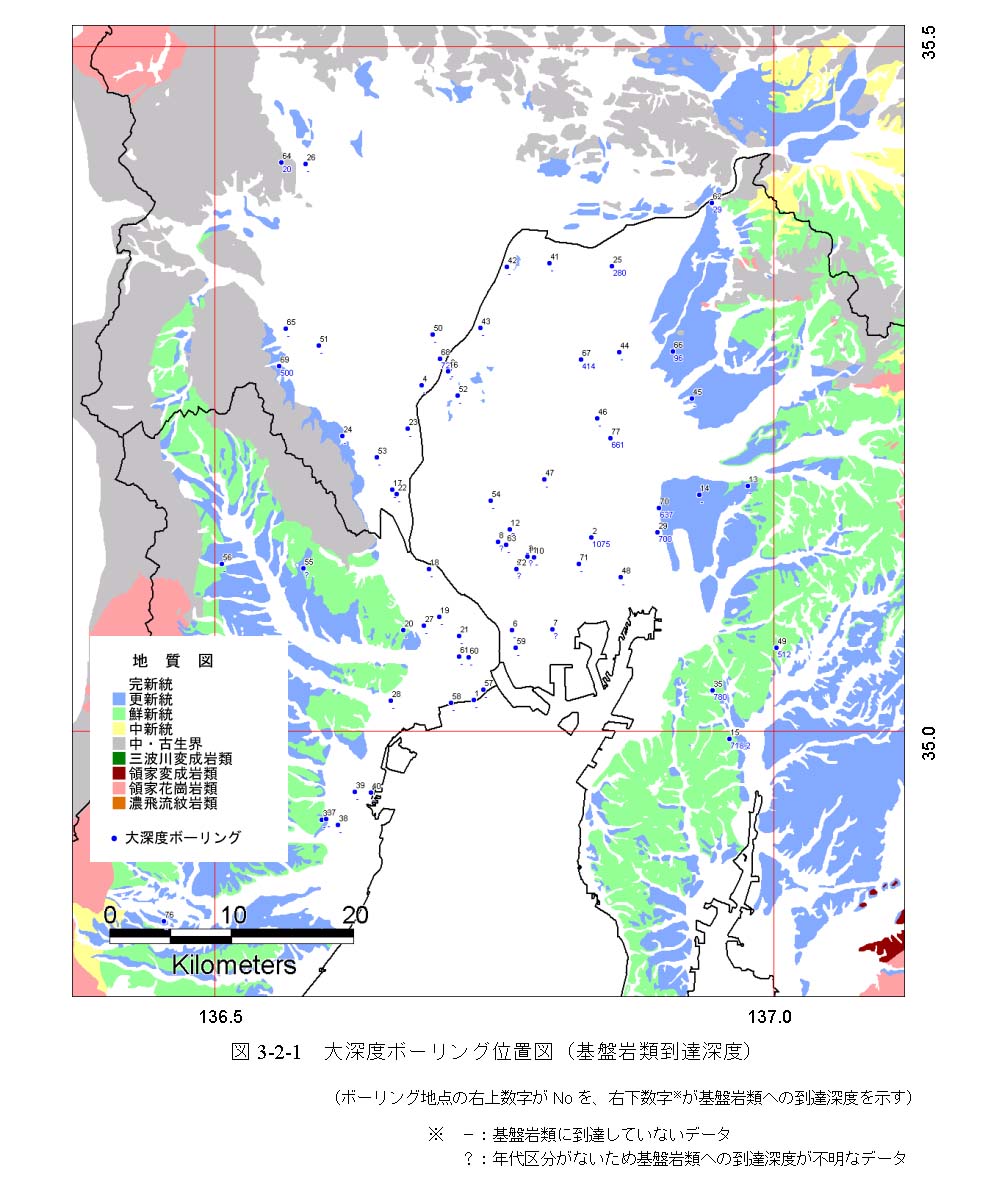 反射波は、砂礫層等のように周辺に比べ、物性値のコントラストが大きい層があると明瞭に現れる。第四系には、特徴的な礫層(第1礫層〜第3礫層)があるため、これらが明瞭な反射を発生していると推定される。熱田層と海部累層と弥富累層は、これらの礫層をもとに層区分されている。一方、第四紀の弥富累層と第三紀鮮新統の東海層群の間にはそのような明瞭な鍵となる層が無いために、反射法断面だけから区分することは難しく、既往の解釈では、反射波の特徴とボーリングデータを参考に区分されている。東海層群と中新統の境界も同様にして明瞭な反射面が無いために、速度値を参考に層区分が行われている。基盤岩類上面については、測線全体にわたり追跡できる明瞭な反射面として解釈されている。これは、同時に実施された屈折法探査の結果からも裏付けられている。
