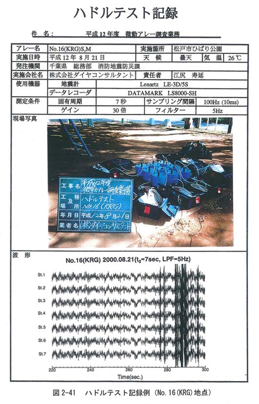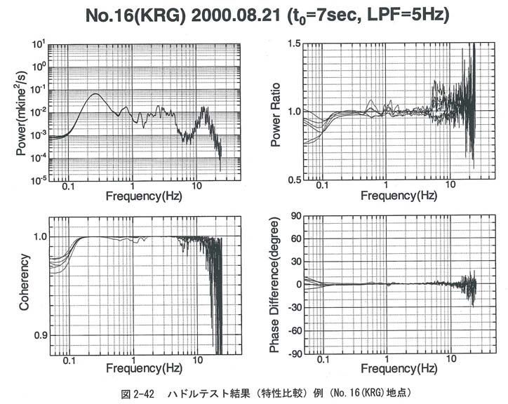 ・観測に先立ち、使用する機器を近接設置して5分程度の微動観測を行うキャリブレ−ション(ハドルテスト)を実施し、コヒ−レンス等を求めて使用機器の感度特性等が揃っていることをチェックした。中・小アレーの観測で実施したハドルテスト記録の例を図2−41に、特性比較の結果を図2−42に示す。